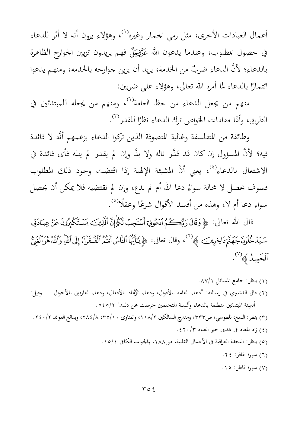 وطائفة من المتفلسفة وغالية المتصوفة الذين تركوا الدعاء بزعمهم أنَّه لا فائدة فيه؛ لأنَّ المسؤول إن كان قد قدَّر ناله ولا بدَّ وإن لم يقدر لم ينله فأي فائدة في الاشتغال بالدعاء (¬٤)، يعني أنَّ المشيئة الإلهية إذا اقتضت وجود ذلك المطلوب فسوف يحصل لا محالة سواءً دعا الله أم لم يدع، وإن لم تقتضيه فلا يمكن أن يحصل سواء دعا أم لا، وهذه من أفسد الأقوال شرعًا وعقلًا (¬٥).