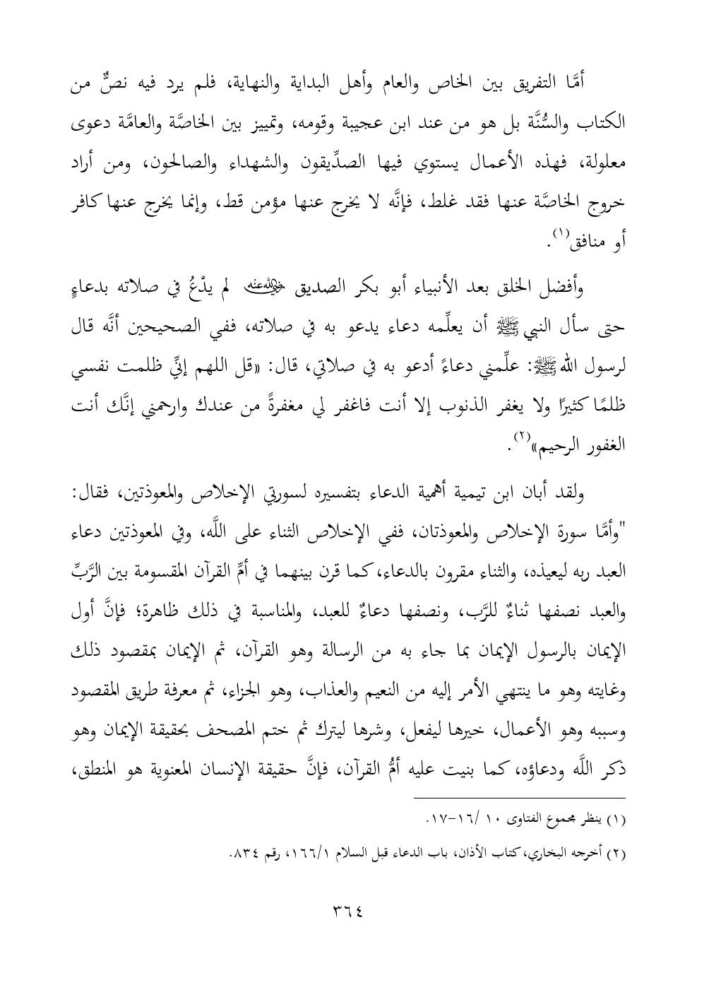 ولقد أبان ابن تيمية أهمية الدعاء بتفسيره لسورتي الإخلاص والمعوذتين، فقال: "وأمَّا سورة الإخلاص والمعوذتان، ففي الإخلاص الثناء على اللَّه، وفي المعوذتين دعاء العبد ربه ليعيذه، والثناء مقرون بالدعاء، كما قرن بينهما في أمِّ القرآن المقسومة بين الرَّبِّ والعبد نصفها ثناءٌ للرَّب، ونصفها دعاءٌ للعبد، والمناسبة في ذلك ظاهرة؛ فإنَّ أول الإيمان بالرسول الإيمان بما جاء به من الرسالة وهو القرآن، ثم الإيمان بمقصود ذلك وغايته وهو ما ينتهي الأمر إليه من النعيم والعذاب، وهو الجزاء، ثم معرفة طريق المقصود وسببه وهو الأعمال، خيرها ليفعل، وشرها ليترك ثم ختم المصحف بحقيقة الإيمان وهو ذكر اللَّه ودعاؤه، كما بنيت عليه أمُّ القرآن، فإنَّ حقيقة الإنسان المعنوية هو المنطق،