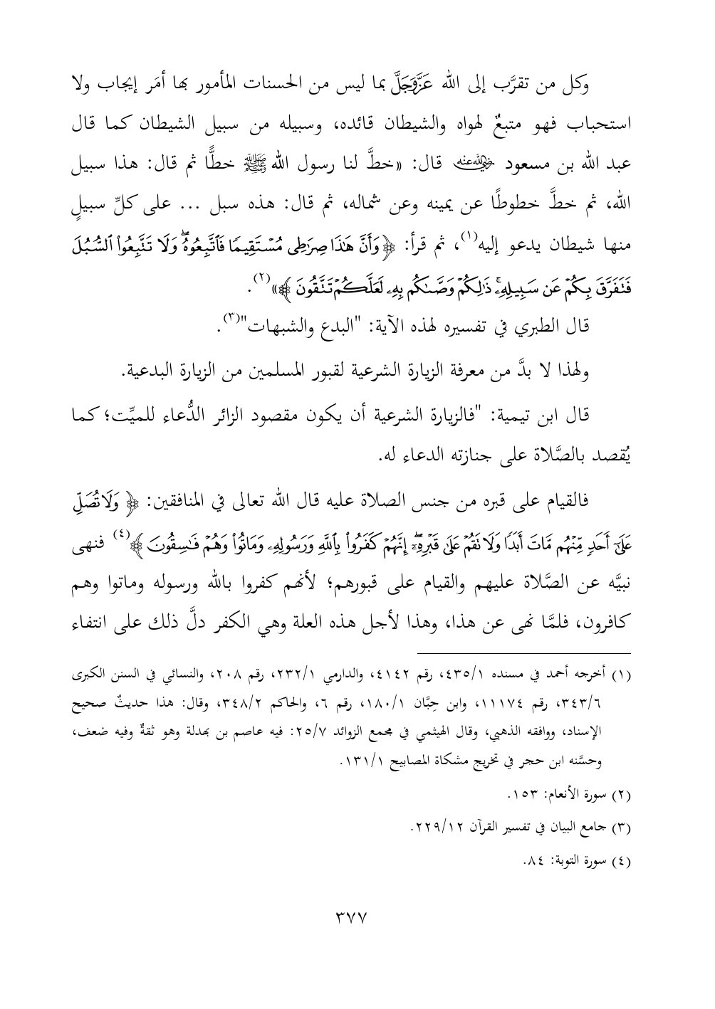وكل من تقرَّب إلى الله - عز وجل - بما ليس من الحسنات المأمور بها أمَر إيجاب ولا استحباب فهو متبعٌ لهواه والشيطان قائده، وسبيله من سبيل الشيطان كما قال عبد الله بن مسعود - رضي الله عنه - قال: «خطَّ لنا رسول الله - صلى الله عليه وسلم - خطًّا ثم قال: هذا سبيل الله، ثم خطَّ خطوطًا عن يمينه وعن شماله، ثم قال: هذه سبل ... على كلِّ سبيلٍ منها شيطان يدعو إليه (¬١)، ثم قرأ: {وَأَنَّ هَذَا صِرَاطِي مُسْتَقِيمًا فَاتَّبِعُوهُ وَلَا تَتَّبِعُوا السُّبُلَ فَتَفَرَّقَ بِكُمْ عَنْ سَبِيلِهِ ذَلِكُمْ وَصَّاكُمْ بِهِ لَعَلَّكُمْ تَتَّقُونَ}» (¬٢).