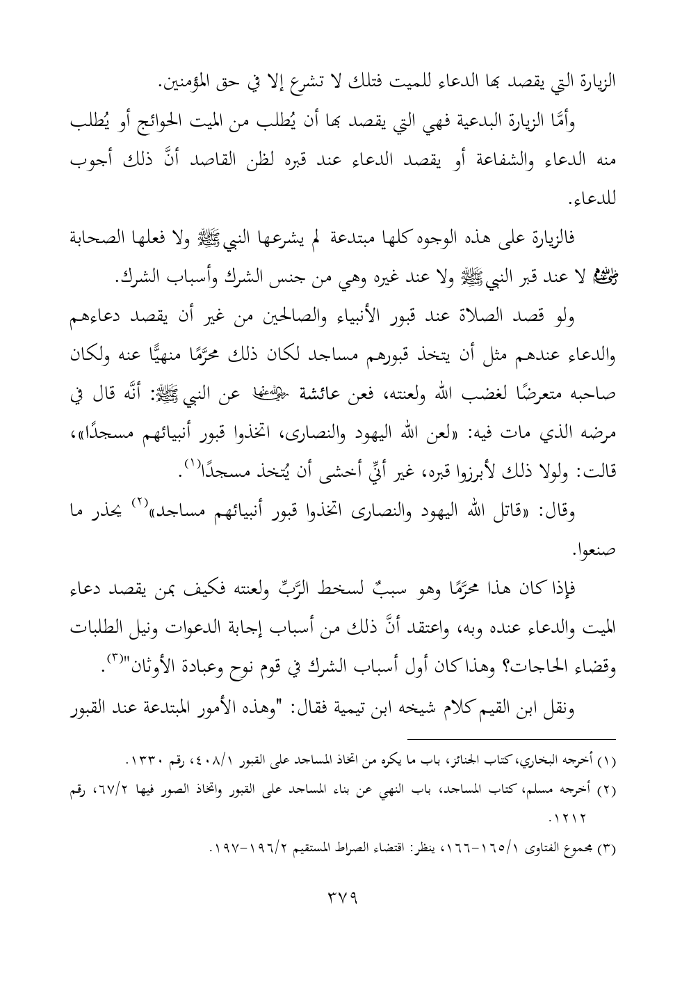 ونقل ابن القيم كلام شيخه ابن تيمية فقال: "وهذه الأمور المبتدعة عند القبور