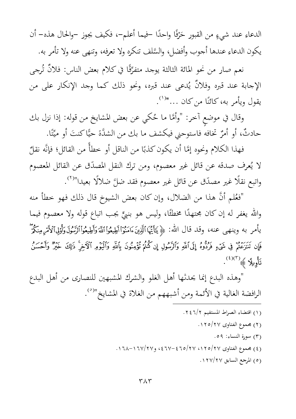"فعُلم أنَّ هذا من الضلال، وإن كان بعض الشيوخ قال ذلك فهو خطأ منه والله يغفر له إن كان مجتهدًا مخطئًا، وليس هو بنبيٍّ يجب اتباع قوله ولا معصوم فيما يأمر به وينهى عنه، وقد قال الله: {يَاأَيُّهَا الَّذِينَ آمَنُوا أَطِيعُوا اللَّهَ وَأَطِيعُوا الرَّسُولَ وَأُولِي الْأَمْرِ مِنْكُمْ فَإِنْ تَنَازَعْتُمْ فِي شَيْءٍ فَرُدُّوهُ إِلَى اللَّهِ وَالرَّسُولِ إِنْ كُنْتُمْ تُؤْمِنُونَ بِاللَّهِ وَالْيَوْمِ الْآخِرِ ذَلِكَ خَيْرٌ وَأَحْسَنُ تَأْوِيلًا} (¬٣) (¬٤).