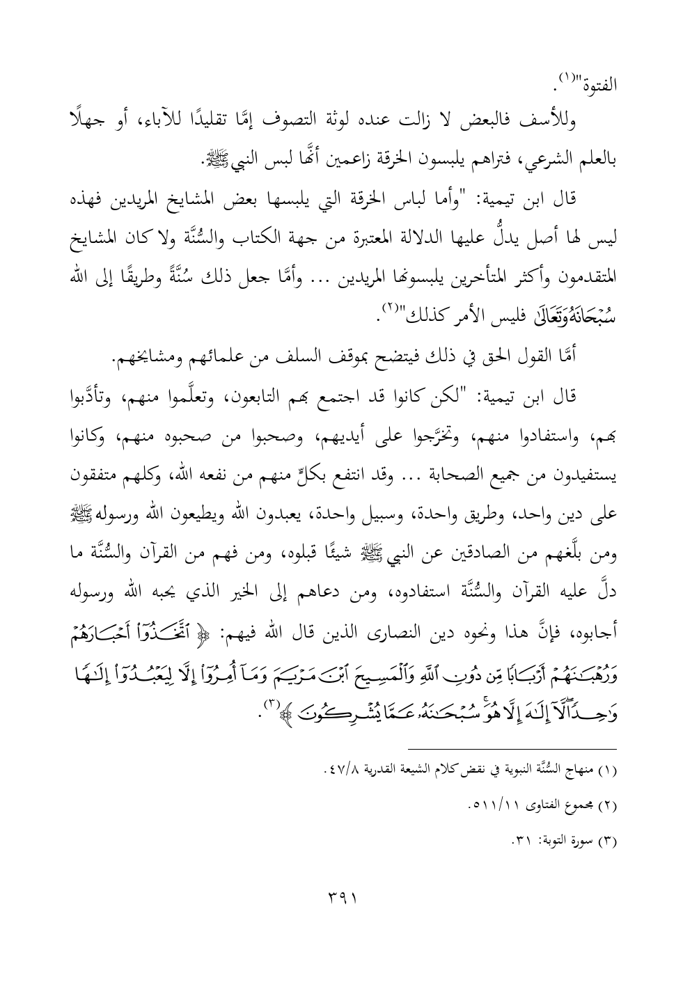 قال ابن تيمية: "وأما لباس الخرقة التي يلبسها بعض المشايخ المريدين فهذه ليس لها أصل يدلُّ عليها الدلالة المعتبرة من جهة الكتاب والسُّنَّة ولا كان المشايخ المتقدمون وأكثر المتأخرين يلبسونها المريدين ... وأمَّا جعل ذلك سُنَّةً وطريقًا إلى الله - سبحانه وتعالى - فليس الأمر كذلك" (¬٢).