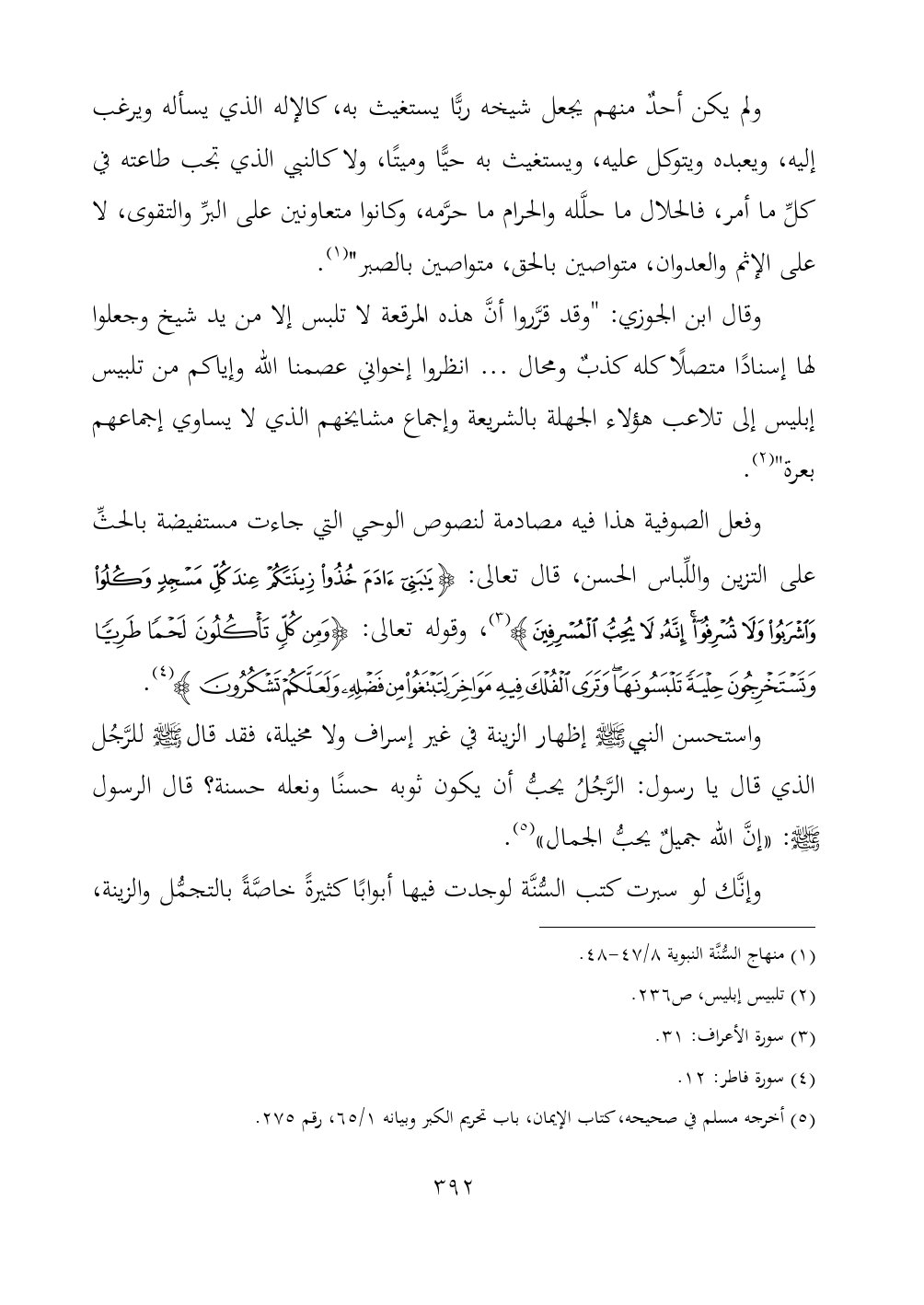 وفعل الصوفية هذا فيه مصادمة لنصوص الوحي التي جاءت مستفيضة بالحثِّ على التزين واللِّباس الحسن، قال تعالى: {يَابَنِي آدَمَ خُذُوا زِينَتَكُمْ عِنْدَ كُلِّ مَسْجِدٍ وَكُلُوا وَاشْرَبُوا وَلَا تُسْرِفُوا إِنَّهُ لَا يُحِبُّ الْمُسْرِفِينَ} (¬٣)، وقوله تعالى: {وَمِنْ كُلٍّ تَأْكُلُونَ لَحْمًا طَرِيًّا وَتَسْتَخْرِجُونَ حِلْيَةً تَلْبَسُونَهَا وَتَرَى الْفُلْكَ فِيهِ مَوَاخِرَ لِتَبْتَغُوا مِنْ فَضْلِهِ وَلَعَلَّكُمْ تَشْكُرُونَ} (¬٤).