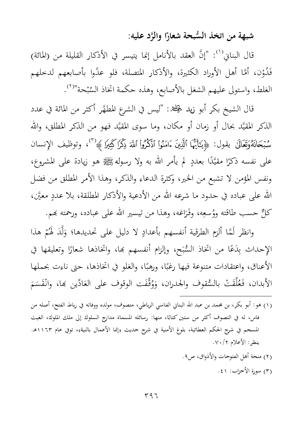 قال البناني (¬١): "إنَّ العقد بالأنامل إنما يتيسر في الأذكار القليلة من (المائة) فَدُوْن، أمَّا أهل الأوراد الكثيرة، والأذكار المتصلة، فلو عدَّوا بأصابعهم لدخلهم الغلط، واستولى عليهم الشغل بالأصابع، وهذه حكمة اتخاذ السُبْحة" (¬٢).