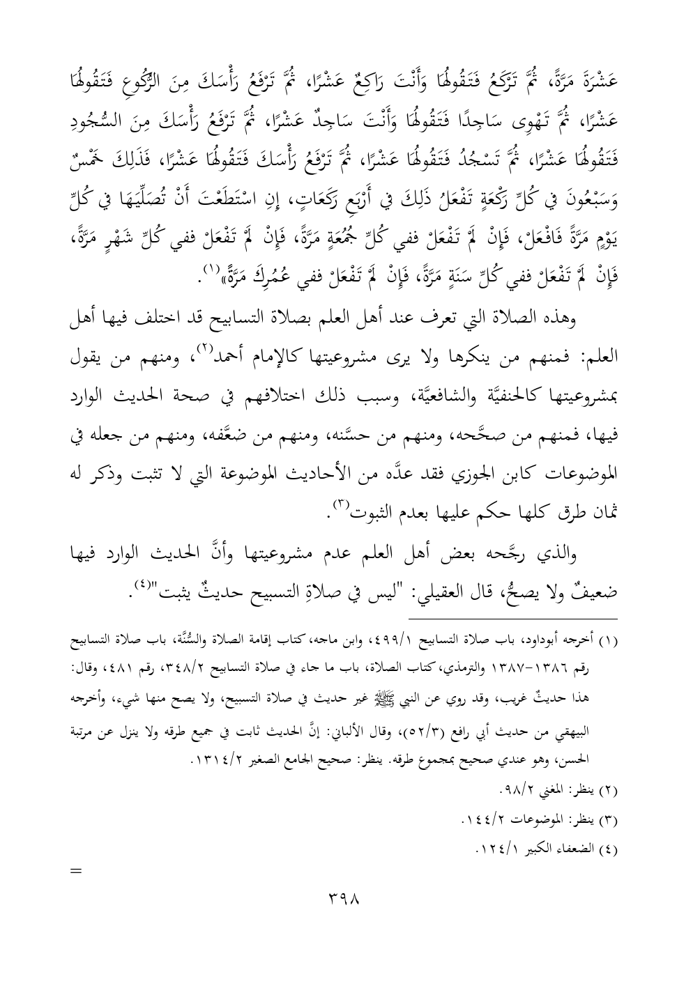 والذي رجَّحه بعض أهل العلم عدم مشروعيتها وأنَّ الحديث الوارد فيها ضعيفٌ ولا يصحُّ، قال العقيلي: "ليس في صلاةِ التسبيح حديثٌ يثبت" (¬٤).