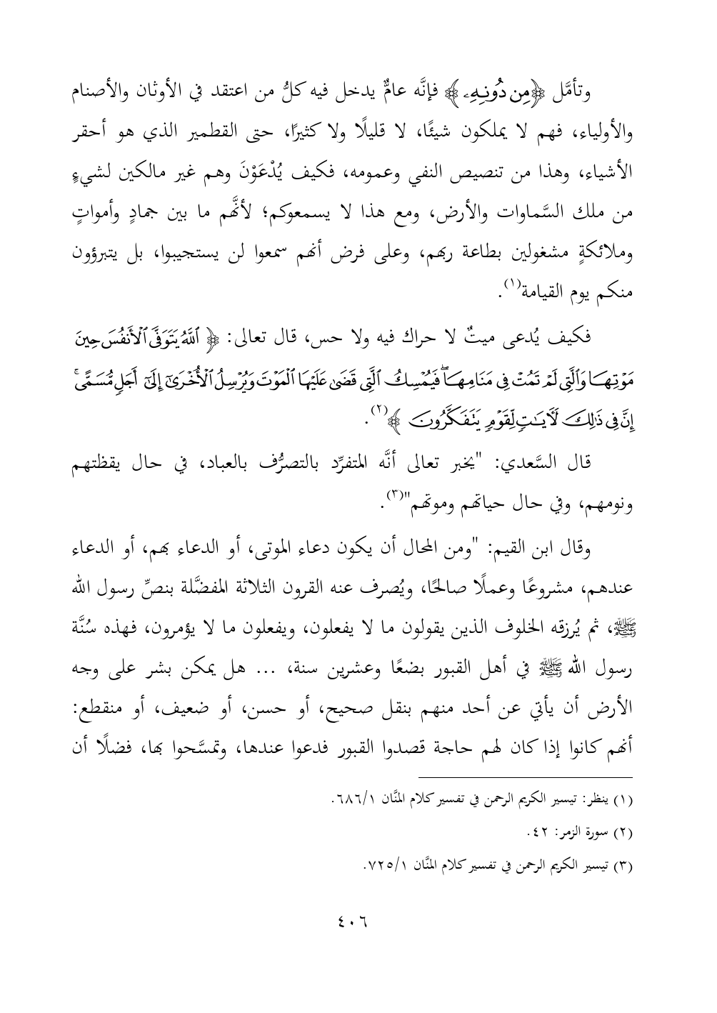 فكيف يُدعى ميتٌ لا حراك فيه ولا حس، قال تعالى: {اللَّهُ يَتَوَفَّى الْأَنْفُسَ حِينَ مَوْتِهَا وَالَّتِي لَمْ تَمُتْ فِي مَنَامِهَا فَيُمْسِكُ الَّتِي قَضَى عَلَيْهَا الْمَوْتَ وَيُرْسِلُ الْأُخْرَى إِلَى أَجَلٍ مُسَمًّى إِنَّ فِي ذَلِكَ لَآيَاتٍ لِقَوْمٍ يَتَفَكَّرُونَ} (¬٢).