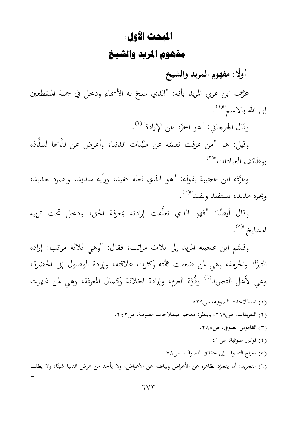 وقال أيضًا: "فهو الذي تعلَّقت إرادته بمعرفة الحق، ودخل تحت تربية المشايخ" (¬٥).