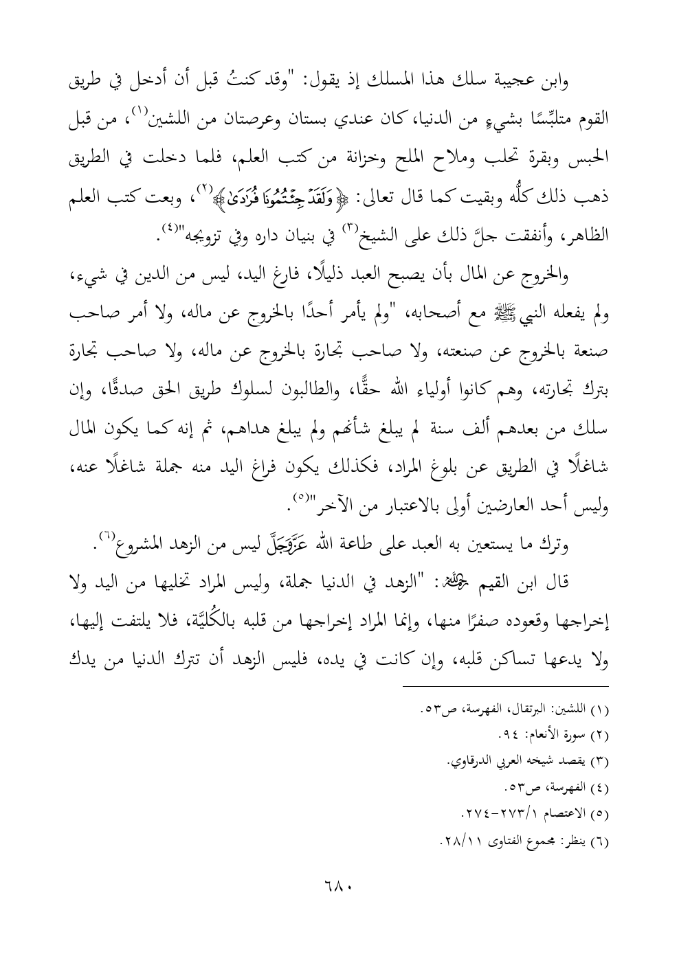 والخروج عن المال بأن يصبح العبد ذليلًا، فارغ اليد، ليس من الدين في شيء، ولم يفعله النبي - صلى الله عليه وسلم - مع أصحابه، "ولم يأمر أحدًا بالخروج عن ماله، ولا أمر صاحب صنعة بالخروج عن صنعته، ولا صاحب تجارة بالخروج عن ماله، ولا صاحب تجارة بترك تجارته، وهم كانوا أولياء الله حقًّا، والطالبون لسلوك طريق الحق صدقًا، وإن سلك من بعدهم ألف سنة لم يبلغ شأنهم ولم يبلغ هداهم، ثم إنه كما يكون المال شاغلًا في الطريق عن بلوغ المراد، فكذلك يكون فراغ اليد منه جملة شاغلًا عنه، وليس أحد العارضين أولى بالاعتبار من الآخر" (¬٥).