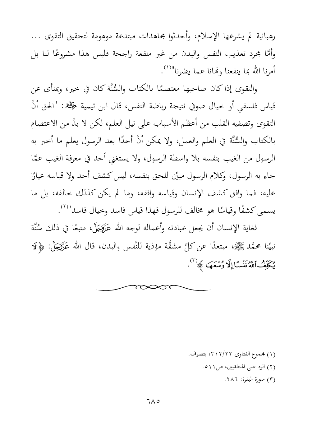 والتقوى إذا كان صاحبها معتصمًا بالكتاب والسُّنَّة كان في خير، وبمنأى عن قياس فلسفي أو خيال صوفي نتيجة رياضة النفس، قال ابن تيمية - رحمه الله -: "الحق أنَّ التقوى وتصفية القلب من أعظم الأسباب على نيل العلم، لكن لا بدَّ من الاعتصام بالكتاب والسُّنَّة في العلم والعمل، ولا يمكن أنَّ أحدًا بعد الرسول يعلم ما أخبر به الرسول من الغيب بنفسه بلا واسطة الرسول، ولا يستغني أحد في معرفة الغيب عمَّا جاء به الرسول، وكلام الرسول مبيِّن للحق بنفسه، ليس كشف أحد ولا قياسه عيارًا عليه، فما وافق كشف الإنسان وقياسه وافقه، وما لم يكن كذلك خالفه، بل ما يسمى كشفًا وقياسًا هو مخالف للرسول فهذا قياس فاسد وخيال فاسد" (¬٢).
