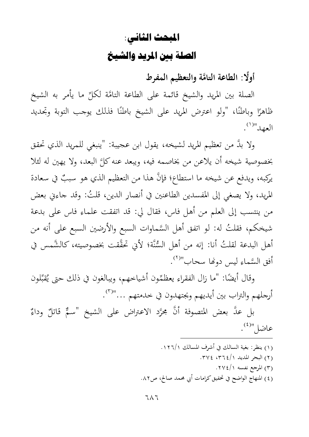 بل عدَّ بعض المتصوفة أنَّ مجرَّد الاعتراض على الشيخ "سمٌّ قاتلٌ وداءٌ عاضل" (¬٤).