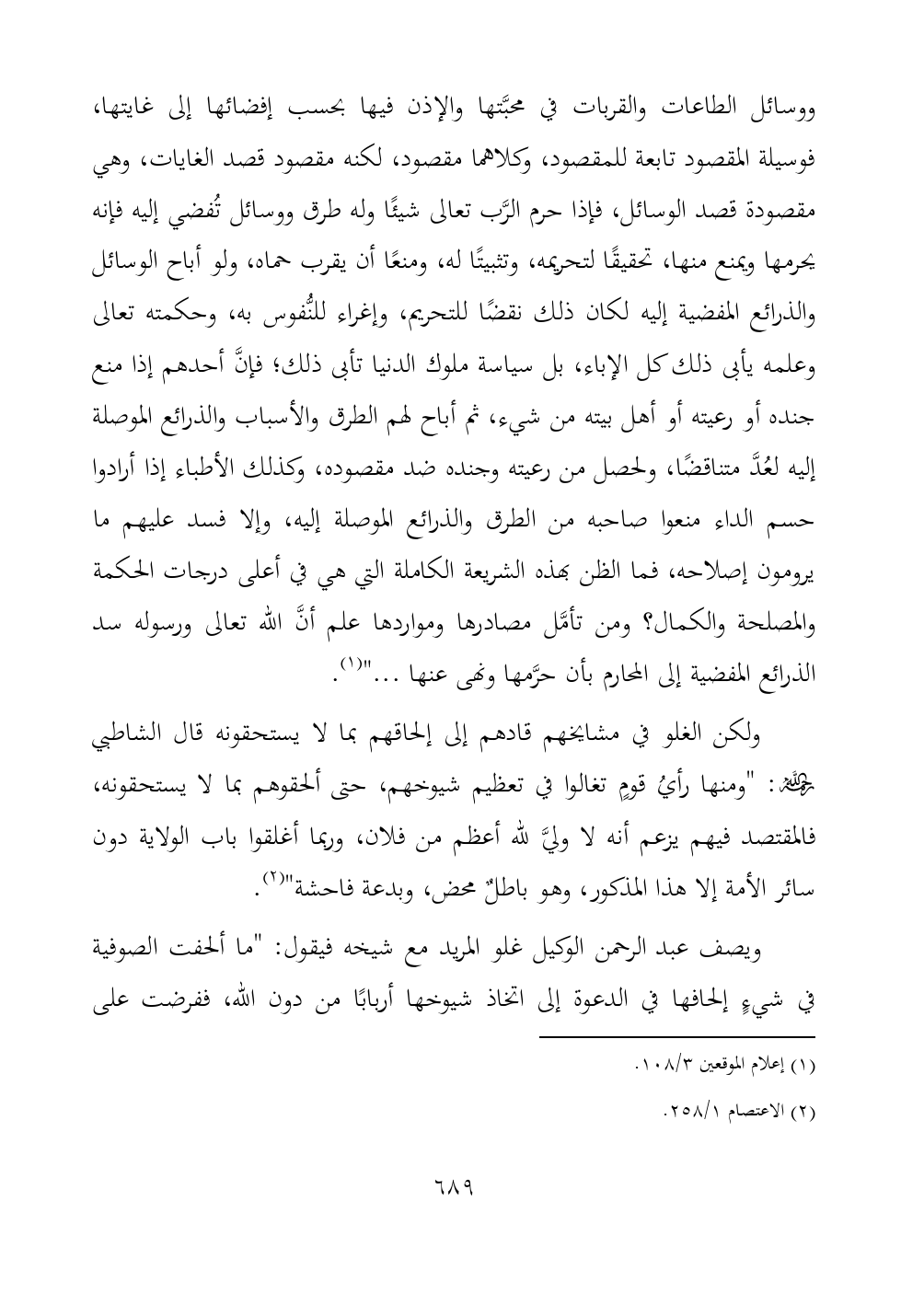 ولكن الغلو في مشايخهم قادهم إلى إلحاقهم بما لا يستحقونه قال الشاطبي - رحمه الله -: "ومنها رأيُ قومٍ تغالوا في تعظيم شيوخهم، حتى ألحقوهم بما لا يستحقونه، فالمقتصد فيهم يزعم أنه لا وليَّ لله أعظم من فلان، وربما أغلقوا باب الولاية دون سائر الأمة إلا هذا المذكور، وهو باطلٌ محض، وبدعة فاحشة" (¬٢).