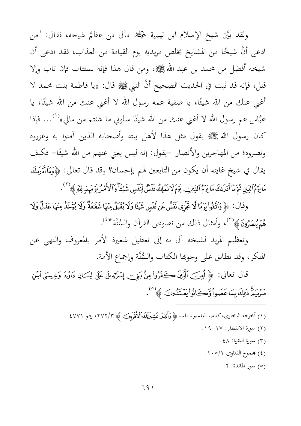 ولقد بيَّن شيخ الإسلام ابن تيمية - رحمه الله - مآل من عظمَّ شيخه، فقال: "من ادعى أنَّ شيخًا من المشايخ يخلص مريديه يوم القيامة من العذاب، فقد ادعى أن شيخه أفضل من محمد بن عبد الله - صلى الله عليه وسلم -، ومن قال هذا فإنه يستتاب فإن تاب وإلا قتل، فإنه قد ثبت في الحديث الصحيح أنَّ النبي - صلى الله عليه وسلم - قال: «يا فاطمة بنت محمد لا أغني عنك من الله شيئًا، يا صفية عمة رسول الله لا أغني عنك من الله شيئًا، يا عبَّاس عم رسول الله لا أغني عنك من الله شيئًا سلوني ما شئتم من مالي» (¬١) ... فإذا كان رسول الله - صلى الله عليه وسلم - يقول مثل هذا لأهل بيته وأصحابه الذين آمنوا به وعزروه ونصروه؛ من المهاجرين والأنصار -يقول: إنه ليس يغني عنهم من الله شيئًا- فكيف يقال في شيخ غايته أن يكون من التابعين لهم بإحسان؟ وقد قال تعالى: {وَمَا أَدْرَاكَ مَا يَوْمُ الدِّينِ ثُمَّ مَا أَدْرَاكَ مَا يَوْمُ الدِّينِ يَوْمَ لَا تَمْلِكُ نَفْسٌ لِنَفْسٍ شَيْئًا وَالْأَمْرُ يَوْمَئِذٍ لِلَّهِ} (¬٢).