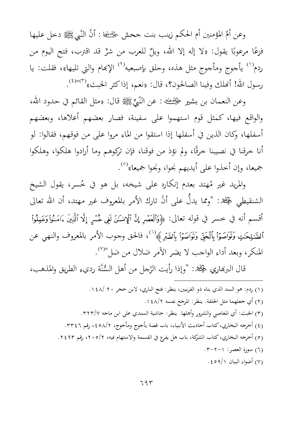 والمريد غير مُهتد بعدم إنكاره على شيخه، بل هو في خُسر، يقول الشيخ الشنقيطي - رحمه الله -: "ومما يدلُّ على أنَّ تارك الأمر بالمعروف غير مهتد، أن الله تعالى أقسم أنه في خسر في قوله تعالى: {وَالْعَصْرِ إِنَّ الْإِنْسَانَ لَفِي خُسْرٍ إِلَّا الَّذِينَ آمَنُوا وَعَمِلُوا الصَّالِحَاتِ وَتَوَاصَوْا بِالْحَقِّ وَتَوَاصَوْا بِالصَّبْرِ} (¬٦)، فالحق وجوب الأمر بالمعروف والنهي عن المنكر، وبعد أداء الواجب لا يضر الآمر ضلال من ضل" (¬٧).
