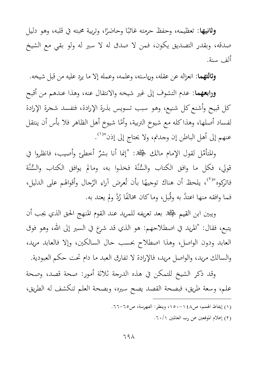 ويبين ابن القيم - رحمه الله - بعد تعريفه للمريد عند القوم المنهج الحق الذي يجب أن يتبع، فقال: "المريد في اصطلاحهم: هو الذي قد شرع في السير إلى الله، وهو فوق العابد ودون الواصل، وهذا اصطلاح بحسب حال السالكين، وإلا فالعابد مريد، والسالك مريد، والواصل مريد، فالإرادة لا تفارق العبد ما دام تحت حكم العبودية.