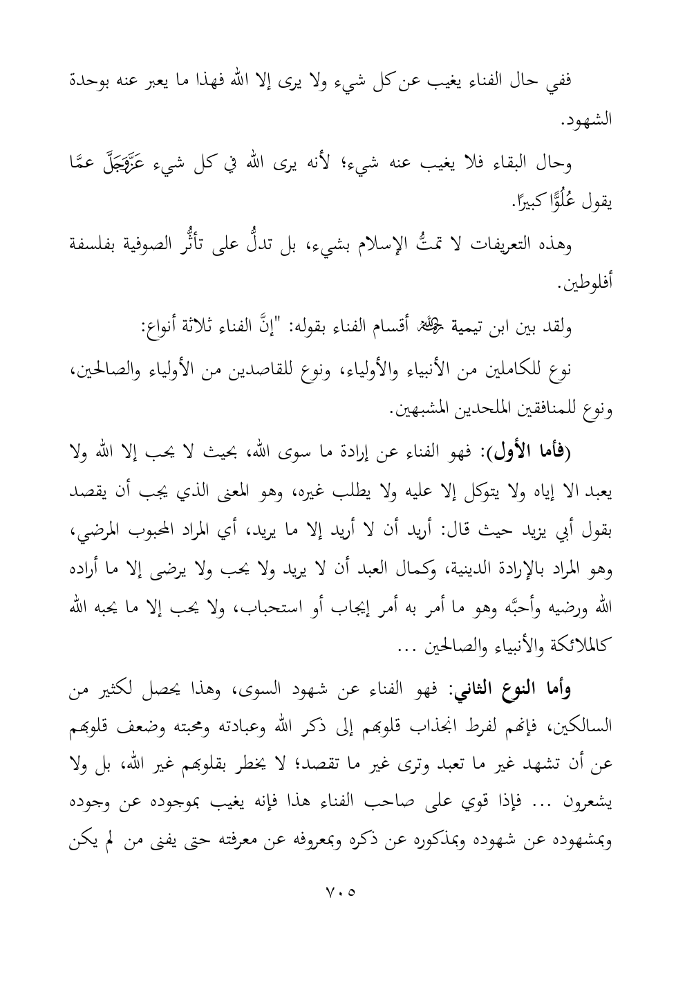 (فأما الأول): فهو الفناء عن إرادة ما سوى الله، بحيث لا يحب إلا الله ولا يعبد الا إياه ولا يتوكل إلا عليه ولا يطلب غيره، وهو المعنى الذي يجب أن يقصد بقول أبي يزيد حيث قال: أريد أن لا أريد إلا ما يريد، أي المراد المحبوب المرضي، وهو المراد بالإرادة الدينية، وكمال العبد أن لا يريد ولا يحب ولا يرضى إلا ما أراده الله ورضيه وأحبَّه وهو ما أمر به أمر إيجاب أو استحباب، ولا يحب إلا ما يحبه الله كالملائكة والأنبياء والصالحين ...