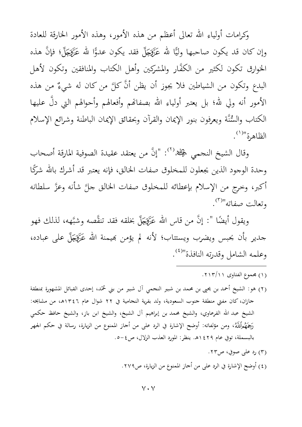 وقال الشيخ النجمي - رحمه الله - (¬٢): "إنَّ من يعتقد عقيدة الصوفية المارقة أصحاب وحدة الوجود الذين يجعلون للمخلوق صفات الخالق، فإنه يعتبر قد أشرك بالله شركًا أكبر، وخرج من الإسلام بإعطائه للمخلوق صفات الخالق جلَّ شأنه وعزَّ سلطانه وتعالت صفاته" (¬٣).