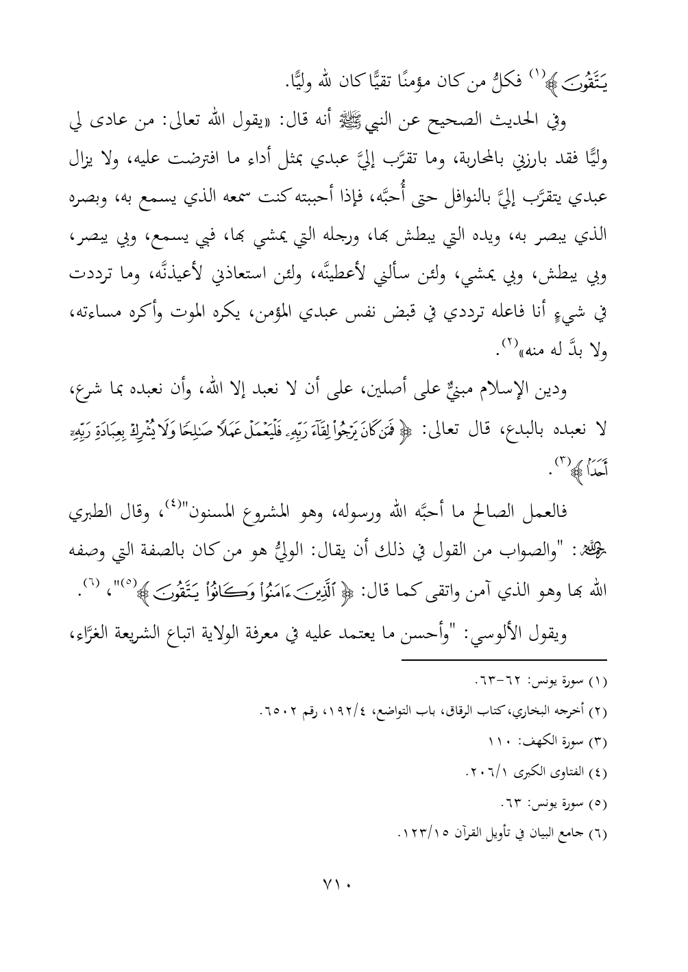 فالعمل الصالح ما أحبَّه الله ورسوله، وهو المشروع المسنون" (¬٤)، وقال الطبري - رحمه الله -: "والصواب من القول في ذلك أن يقال: الوليُّ هو من كان بالصفة التي وصفه الله بها وهو الذي آمن واتقى كما قال: {الَّذِينَ آمَنُوا وَكَانُوا يَتَّقُونَ} (¬٥) "، (¬٦).