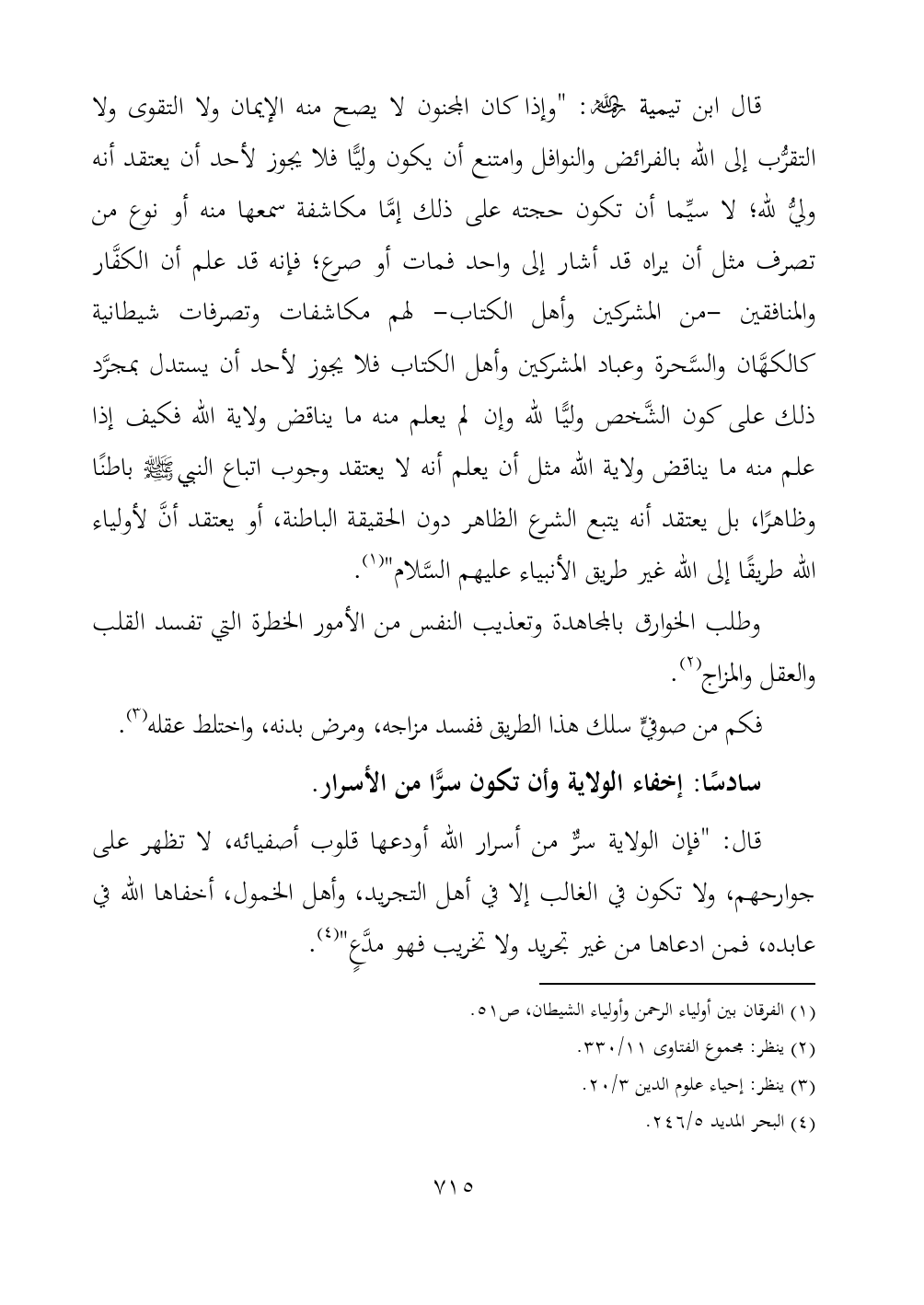 قال ابن تيمية - رحمه الله -: "وإذا كان المجنون لا يصح منه الإيمان ولا التقوى ولا التقرُّب إلى الله بالفرائض والنوافل وامتنع أن يكون وليًّا فلا يجوز لأحد أن يعتقد أنه وليُّ لله؛ لا سيِّما أن تكون حجته على ذلك إمَّا مكاشفة سمعها منه أو نوع من تصرف مثل أن يراه قد أشار إلى واحد فمات أو صرع؛ فإنه قد علم أن الكفَّار والمنافقين -من المشركين وأهل الكتاب- لهم مكاشفات وتصرفات شيطانية كالكهَّان والسَّحرة وعباد المشركين وأهل الكتاب فلا يجوز لأحد أن يستدل بمجرَّد ذلك على كون الشَّخص وليًّا لله وإن لم يعلم منه ما يناقض ولاية الله فكيف إذا علم منه ما يناقض ولاية الله مثل أن يعلم أنه لا يعتقد وجوب اتباع النبي - صلى الله عليه وسلم - باطنًا وظاهرًا، بل يعتقد أنه يتبع الشرع الظاهر دون الحقيقة الباطنة، أو يعتقد أنَّ لأولياء الله طريقًا إلى الله غير طريق الأنبياء عليهم السَّلام" (¬١).