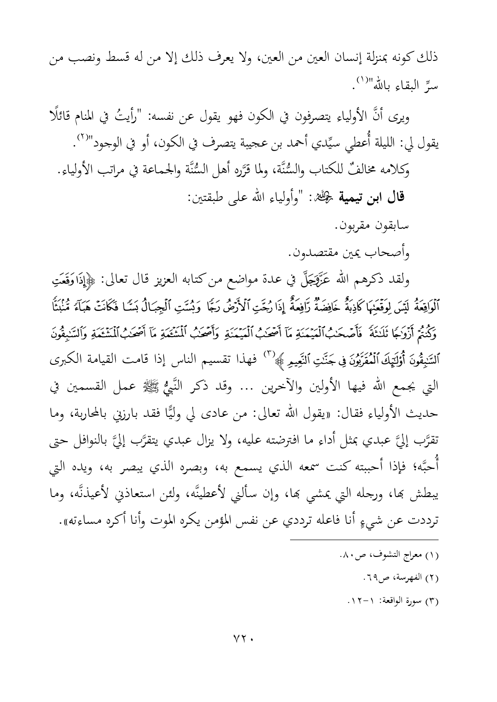 ولقد ذكرهم الله - عز وجل - في عدة مواضع من كتابه العزيز قال تعالى: {إِذَا وَقَعَتِ الْوَاقِعَةُ لَيْسَ لِوَقْعَتِهَا كَاذِبَةٌ خَافِضَةٌ رَافِعَةٌ إِذَا رُجَّتِ الْأَرْضُ رَجًّا وَبُسَّتِ الْجِبَالُ بَسًّا فَكَانَتْ هَبَاءً مُنْبَثًّا وَكُنْتُمْ أَزْوَاجًا ثَلَاثَةً فَأَصْحَابُ الْمَيْمَنَةِ مَا أَصْحَابُ الْمَيْمَنَةِ وَأَصْحَابُ الْمَشْأَمَةِ مَا أَصْحَابُ الْمَشْأَمَةِ وَالسَّابِقُونَ السَّابِقُونَ أُولَئِكَ الْمُقَرَّبُونَ فِي جَنَّاتِ النَّعِيمِ} (¬٣) فهذا تقسيم الناس إذا قامت القيامة الكبرى التي يجمع الله فيها الأولين والآخرين ... وقد ذكر النَّبيُّ - صلى الله عليه وسلم - عمل القسمين في حديث الأولياء فقال: «يقول الله تعالى: من عادى لي وليًّا فقد بارزني بالمحاربة، وما تقرَّب إليَّ عبدي بمثل أداء ما افترضته عليه، ولا يزال عبدي يتقرَّب إليَّ بالنوافل حتى أُحبَّه؛ فإذا أحببته كنت سمعه الذي يسمع به، وبصره الذي يبصر به، ويده التي يبطش بها، ورجله التي يمشي بها، وإن سألني لأعطينَّه، ولئن استعاذني لأعيذنَّه، وما ترددت عن شيءٍ أنا فاعله ترددي عن نفس المؤمن يكره الموت وأنا أكره مساءته».