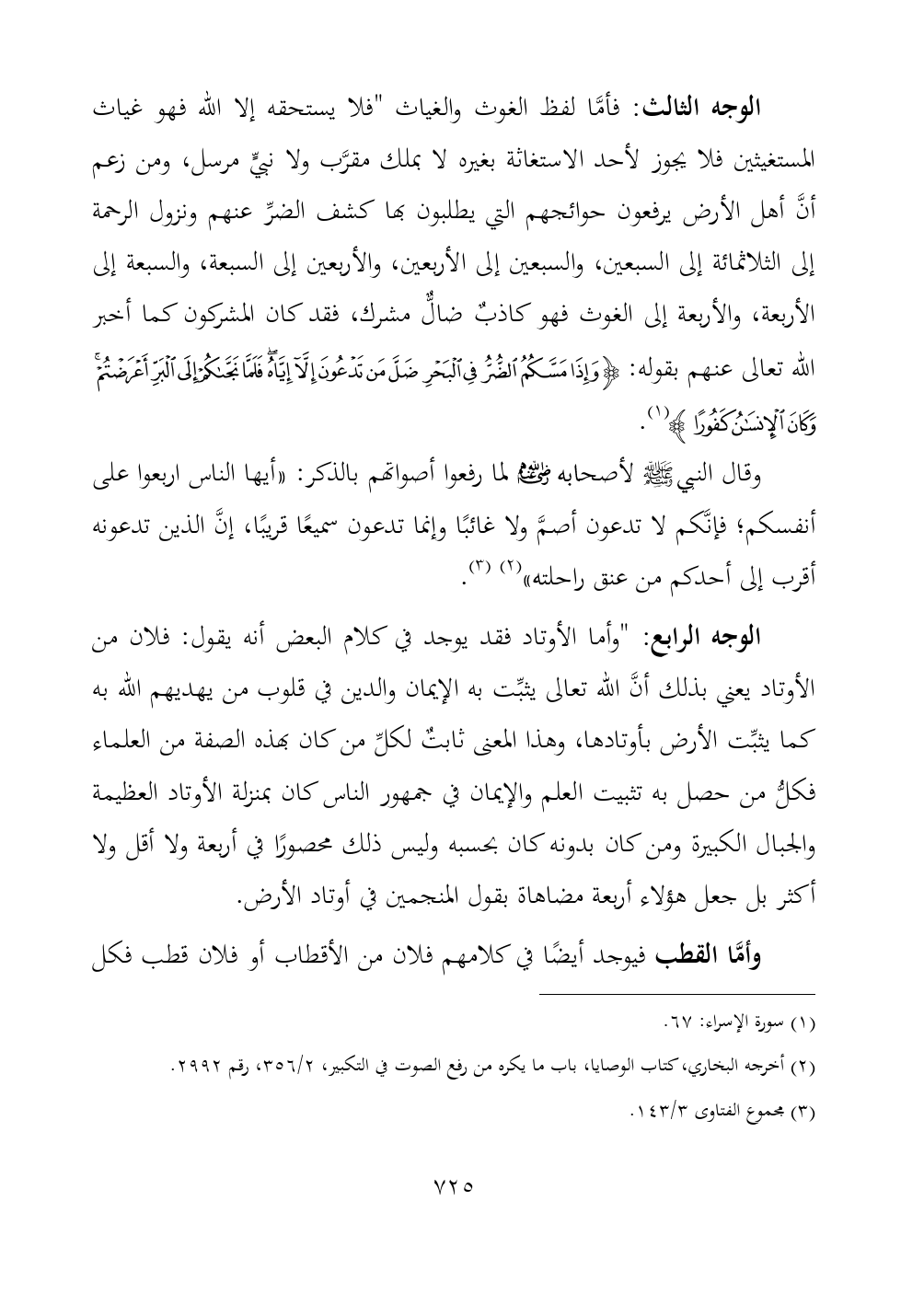 الوجه الثالث: فأمَّا لفظ الغوث والغياث "فلا يستحقه إلا الله فهو غياث المستغيثين فلا يجوز لأحد الاستغاثة بغيره لا بملك مقرَّب ولا نبيٍّ مرسل، ومن زعم أنَّ أهل الأرض يرفعون حوائجهم التي يطلبون بها كشف الضرِّ عنهم ونزول الرحمة إلى الثلاثمائة إلى السبعين، والسبعين إلى الأربعين، والأربعين إلى السبعة، والسبعة إلى الأربعة، والأربعة إلى الغوث فهو كاذبٌ ضالٌّ مشرك، فقد كان المشركون كما أخبر الله تعالى عنهم بقوله: {وَإِذَا مَسَّكُمُ الضُّرُّ فِي الْبَحْرِ ضَلَّ مَنْ تَدْعُونَ إِلَّا إِيَّاهُ فَلَمَّا نَجَّاكُمْ إِلَى الْبَرِّ أَعْرَضْتُمْ وَكَانَ الْإِنْسَانُ كَفُورًا} (¬١).