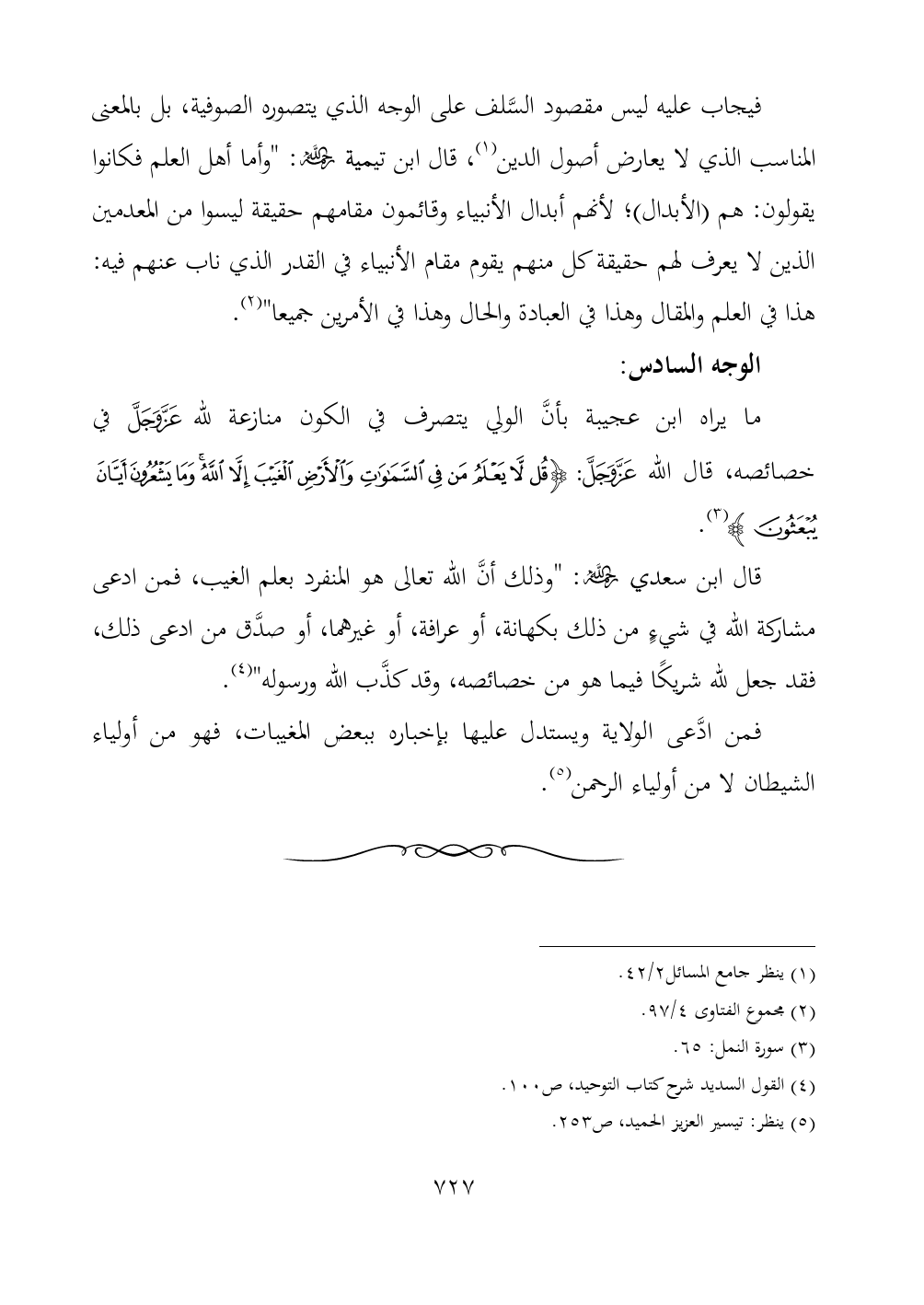 فيجاب عليه ليس مقصود السَّلف على الوجه الذي يتصوره الصوفية، بل بالمعنى المناسب الذي لا يعارض أصول الدين (¬١)، قال ابن تيمية - رحمه الله -: "وأما أهل العلم فكانوا يقولون: هم (الأبدال)؛ لأنهم أبدال الأنبياء وقائمون مقامهم حقيقة ليسوا من المعدمين الذين لا يعرف لهم حقيقة كل منهم يقوم مقام الأنبياء في القدر الذي ناب عنهم فيه: هذا في العلم والمقال وهذا في العبادة والحال وهذا في الأمرين جميعا" (¬٢).