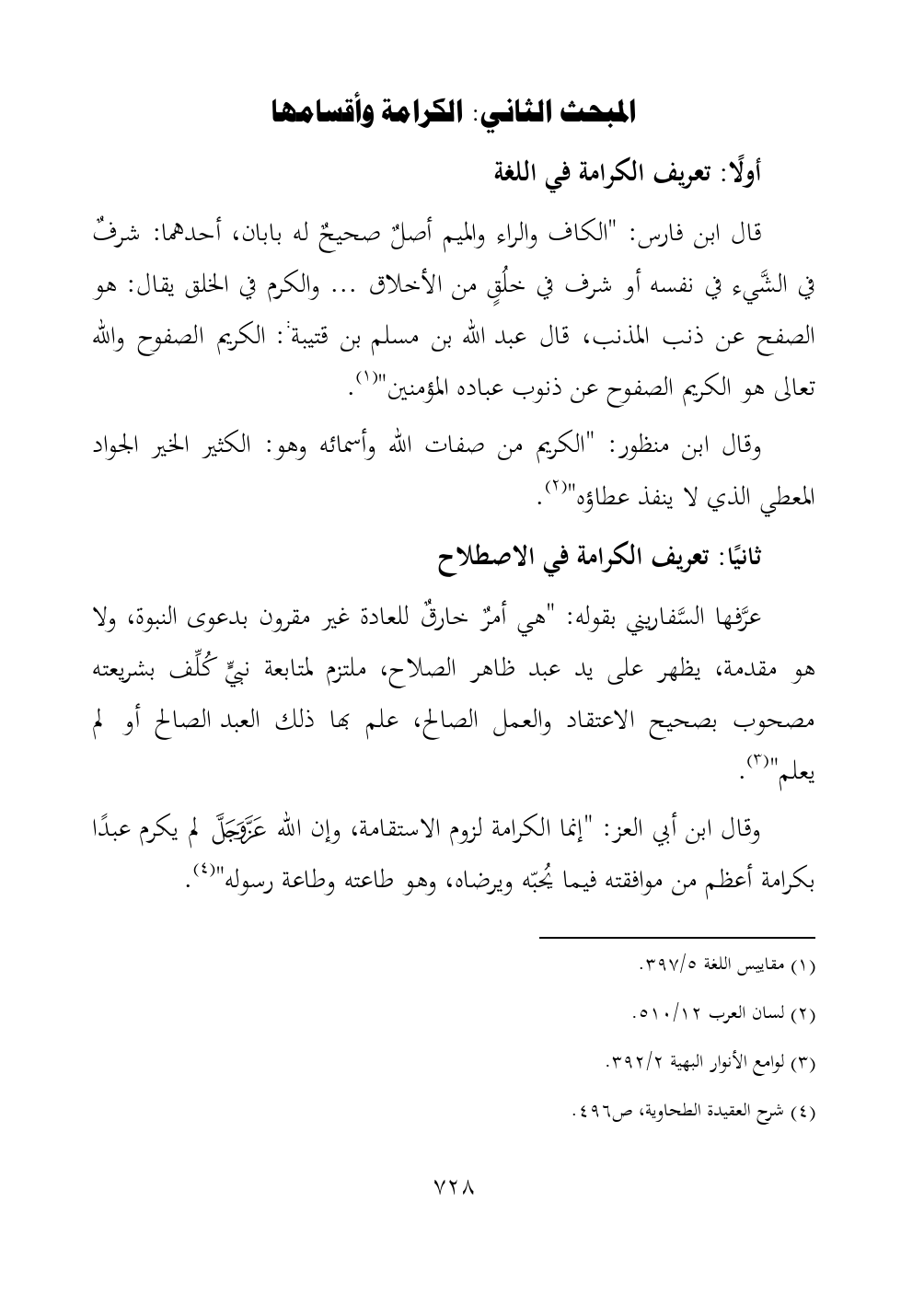 عرَّفها السَّفاريني بقوله: "هي أمرٌ خارقٌ للعادة غير مقرون بدعوى النبوة، ولا هو مقدمة، يظهر على يد عبد ظاهر الصلاح، ملتزم لمتابعة نبيٍّ كُلِّف بشريعته مصحوب بصحيح الاعتقاد والعمل الصالح، علم بها ذلك العبد الصالح أو لم يعلم" (¬٣).