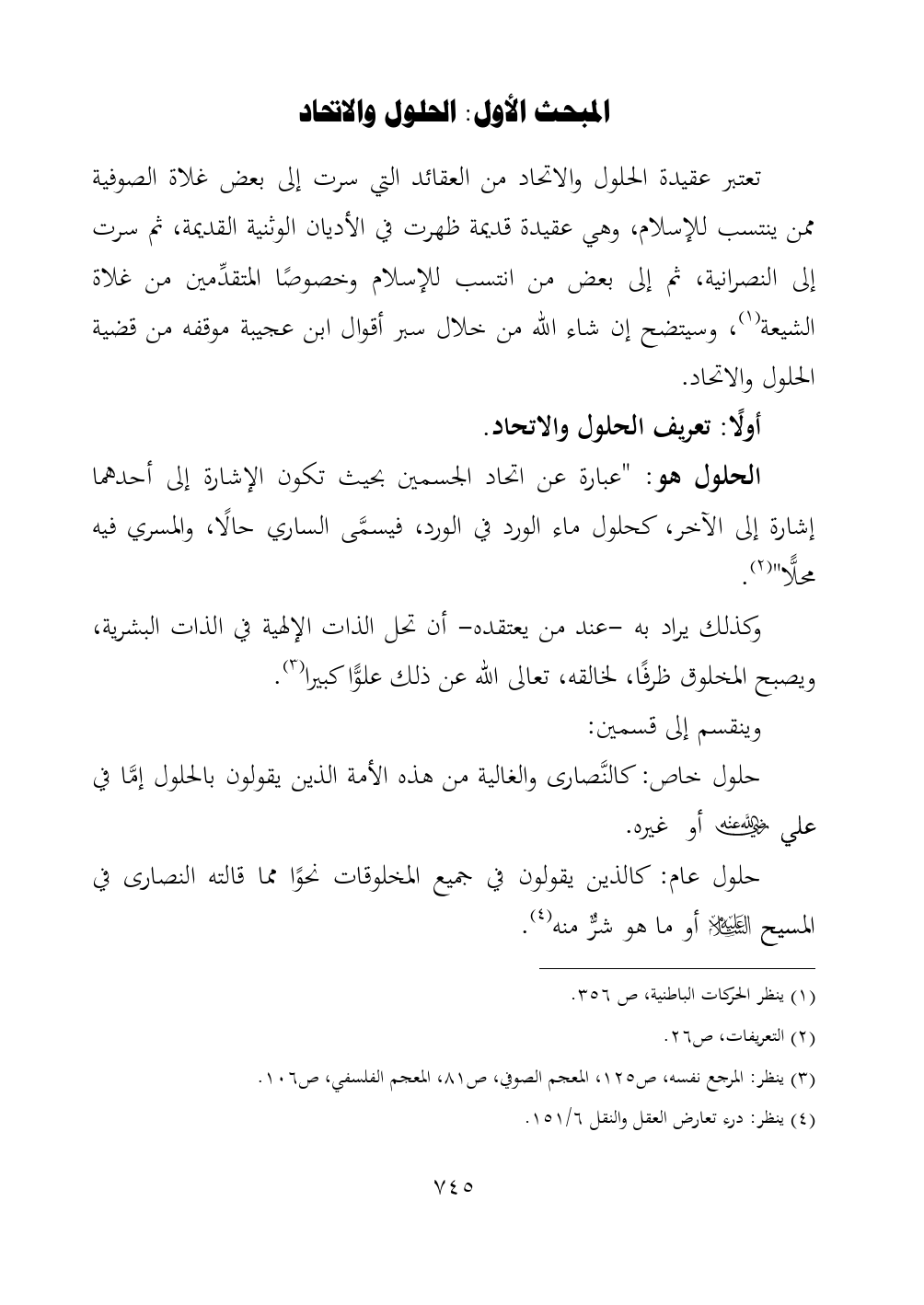 وكذلك يراد به -عند من يعتقده- أن تحل الذات الإلهية في الذات البشرية، ويصبح المخلوق ظرفًا، لخالقه، تعالى الله عن ذلك علوًّا كبيرا (¬٣).