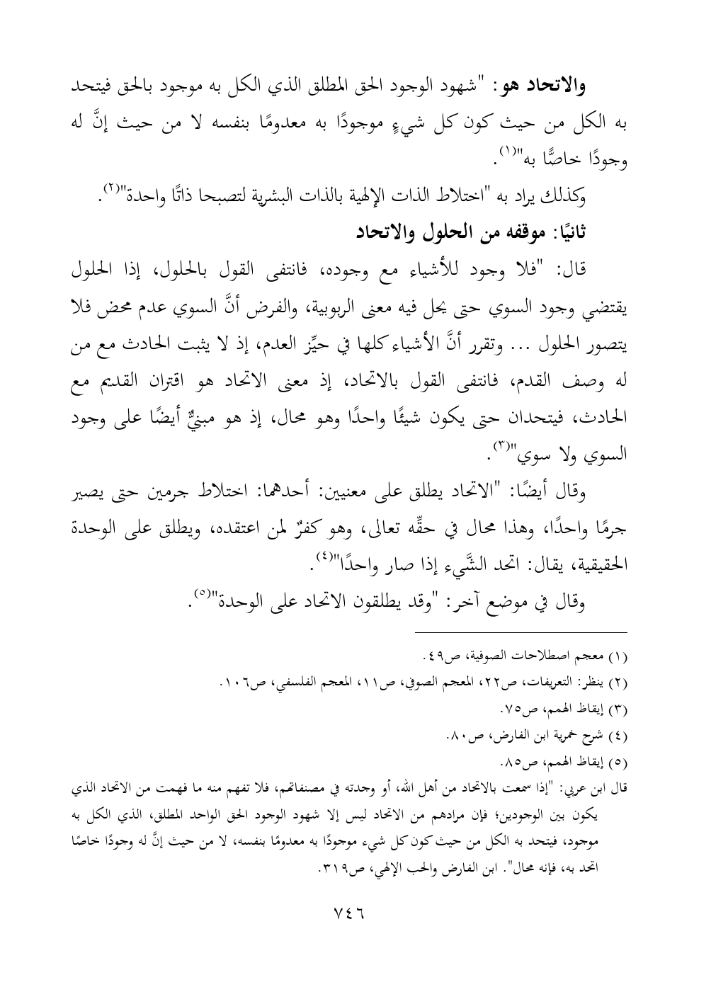 وقال أيضًا: "الاتحاد يطلق على معنيين: أحدهما: اختلاط جرمين حتى يصير جرمًا واحدًا، وهذا محال في حقِّه تعالى، وهو كفرٌ لمن اعتقده، ويطلق على الوحدة الحقيقية، يقال: اتحد الشَّيء إذا صار واحدًا" (¬٤).