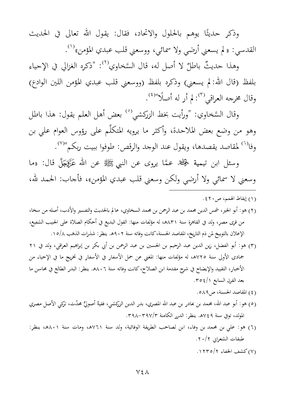 وذكر حديثًا يوهم بالحلول والاتحاد، فقال: يقول الله تعالى في الحديث القدسي: «لم يسعني أرضي ولا سمائي، ووسعني قلب عبدي المؤمن» (¬١).