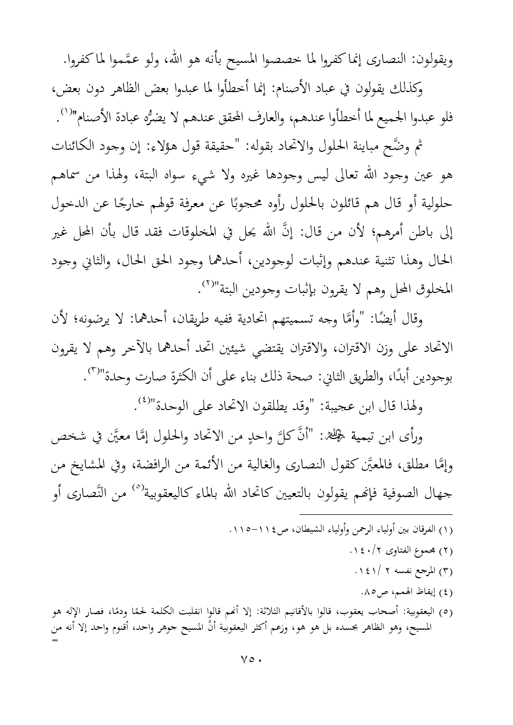 ويقولون: النصارى إنما كفروا لما خصصوا المسيح بأنه هو الله، ولو عمَّموا لما كفروا.