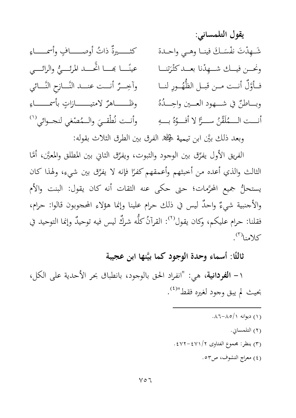 الفريق الأول يفرِّق بين الوجود والثبوت، ويفرِّق الثاني بين المطلق والمعيَّن، أمَّا الثالث والذي أعده من أخبثهم وأعمقهم كفرًا فإنه لا يفرِّق بين شيء، ولهذا كان يستحلُّ جميع المحرَّمات؛ حتى حكى عنه الثقات أنه كان يقول: البنت والأم والأجنبية شيءٌ واحدٌ ليس في ذلك حرام علينا وإنما هؤلاء المحجوبون قالوا: حرام، فقلنا: حرام عليكم، وكان يقول (¬٢): القرآنُ كلُّه شركٌ ليس فيه توحيدٌ وإنما التوحيد في كلامنا (¬٣).