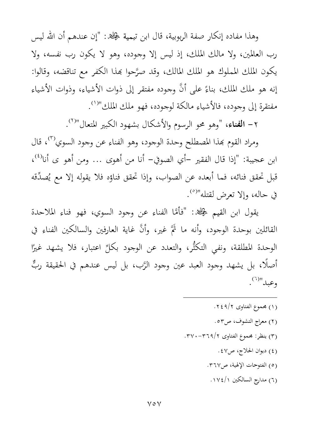 يقول ابن القيم - رحمه الله -: "فأمَّا الفناء عن وجود السوي، فهو فناء الملاحدة القائلين بوحدة الوجود، وأنه ما ثَمَّ غير، وأنَّ غاية العارفين والسالكين الفناء في الوحدة المطلقة، ونفي التكثُّر، والتعدد عن الوجود بكلِّ اعتبار، فلا يشهد غيرًا أصلًا، بل يشهد وجود العبد عين وجود الرَّب، بل ليس عندهم في الحقيقة ربٌّ وعبد" (¬٦).