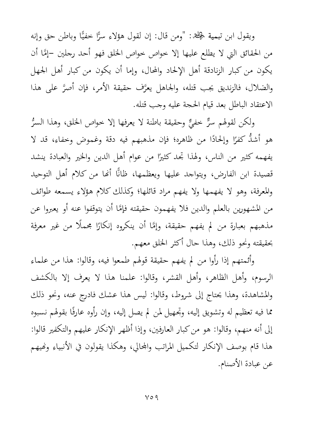 ولكن لقولهم سرٌّ خفيٌّ وحقيقة باطنة لا يعرفها إلا خواص الخلق، وهذا السرُّ هو أشدُّ كفرًا وإلحادًا من ظاهره؛ فإن مذهبهم فيه دقة وغموض وخفاء، قد لا يفهمه كثير من الناس، ولهذا تجد كثيرًا من عوام أهل الدين والخير والعبادة ينشد قصيدة ابن الفارض، ويتواجد عليها ويعظمها، ظانًّا أنها من كلام أهل التوحيد والمعرفة، وهو لا يفهمها ولا يفهم مراد قائلها؛ وكذلك كلام هؤلاء يسمعه طوائف من المشهورين بالعلم والدين فلا يفهمون حقيقته فإمَّا أن يتوقفوا عنه أو يعبروا عن مذهبهم بعبارة من لم يفهم حقيقة، وإمَّا أن ينكروه إنكارًا مجملًا من غير معرفة بحقيقته ونحو ذلك، وهذا حال أكثر الخلق معهم.