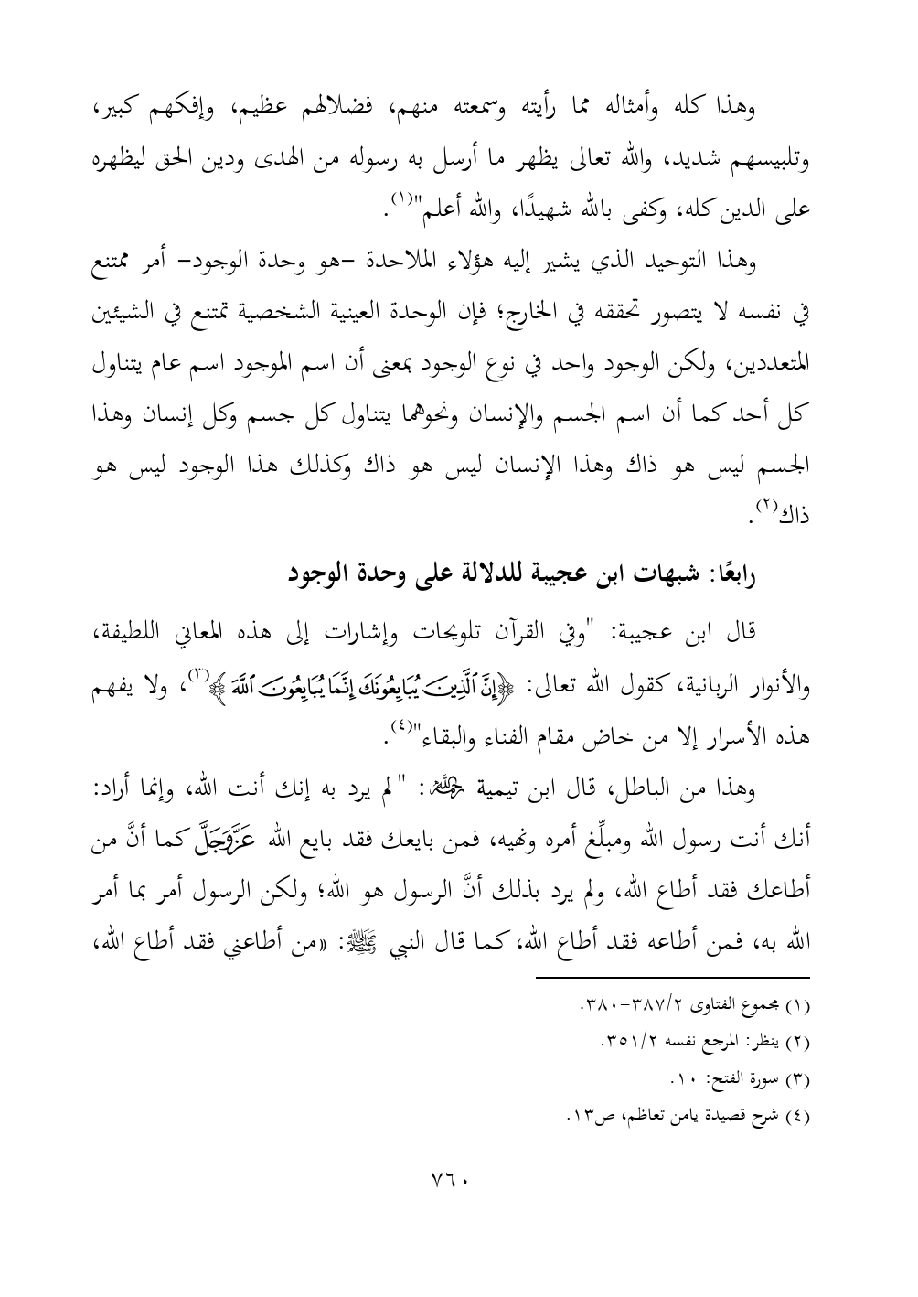 قال ابن عجيبة: "وفي القرآن تلويحات وإشارات إلى هذه المعاني اللطيفة، والأنوار الربانية، كقول الله تعالى: {إِنَّ الَّذِينَ يُبَايِعُونَكَ إِنَّمَا يُبَايِعُونَ اللَّهَ} (¬٣)، ولا يفهم هذه الأسرار إلا من خاض مقام الفناء والبقاء" (¬٤).