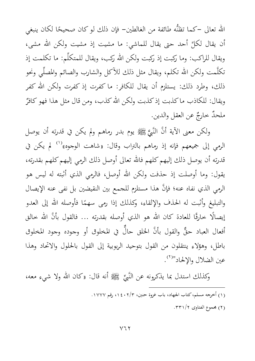 ولكن معنى الآية أنَّ النَّبيَّ - صلى الله عليه وسلم - يوم بدر رماهم ولم يكن في قدرته أن يوصل الرمي إلى جميعهم فإنه إذ رماهم بالتراب وقال: «شاهت الوجوه» (¬١) لم يكن في قدرته أن يوصل ذلك إليهم كلهم فالله تعالى أوصل ذلك الرمي إليهم كلهم بقدرته، يقول: وما أوصلت إذ حذفت ولكن الله أوصل، فالرمي الذي أثبته له ليس هو الرمي الذي نفاه عنه؛ فإنَّ هذا مستلزم للجمع بين النقيضين بل نفى عنه الإيصال والتبليغ وأثبت له الحذف والإلقاء، وكذلك إذا رمى سهمًا فأوصله الله إلى العدو إيصالًا خارقًا للعادة كان الله هو الذي أوصله بقدرته ... فالقول بأنَّ الله خالق أفعال العباد حقٌّ والقول بأنَّ الخلق حالٌّ في المخلوق أو وجوده وجود المخلوق باطل، وهؤلاء ينتقلون من القول بتوحيد الربوبية إلى القول بالحلول والاتحاد وهذا عين الضلال والإلحاد" (¬٢).