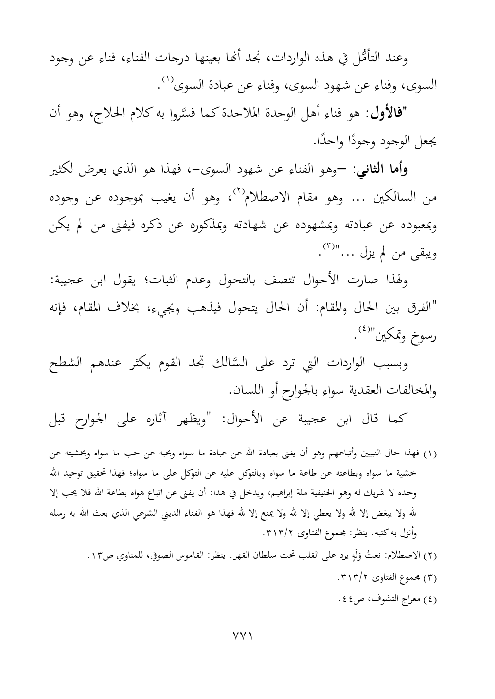 "فالأول: هو فناء أهل الوحدة الملاحدة كما فسَّروا به كلام الحلاج، وهو أن يجعل الوجود وجودًا واحدًا.
