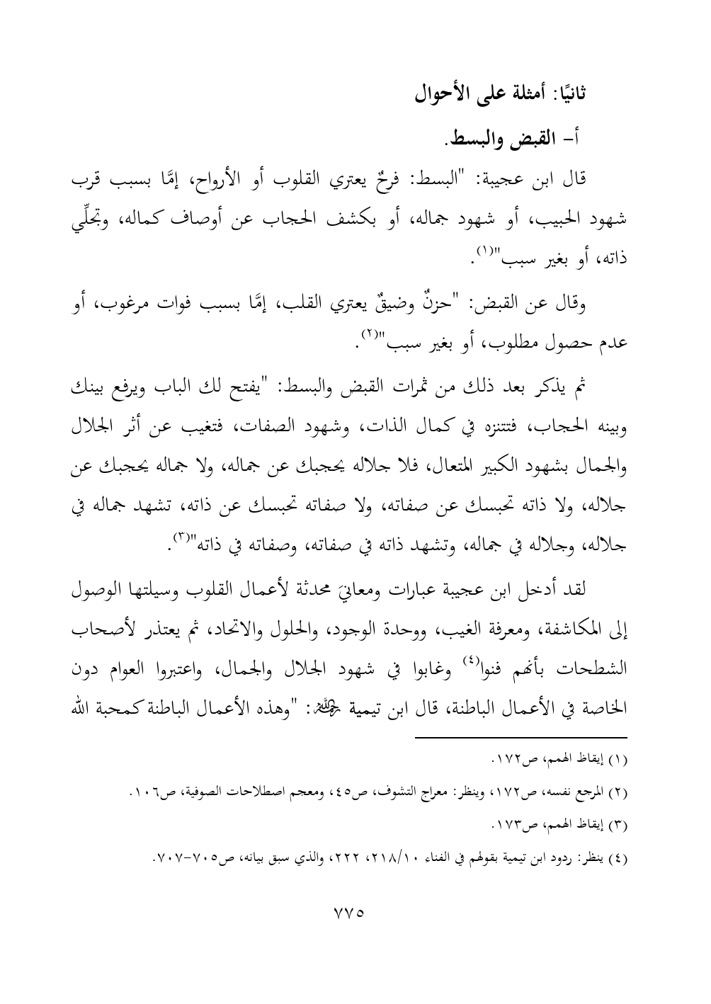 لقد أدخل ابن عجيبة عبارات ومعانيَ محدثة لأعمال القلوب وسيلتها الوصول إلى المكاشفة، ومعرفة الغيب، ووحدة الوجود، والحلول والاتحاد، ثم يعتذر لأصحاب الشطحات بأنهم فنوا (¬٤) وغابوا في شهود الجلال والجمال، واعتبروا العوام دون الخاصة في الأعمال الباطنة، قال ابن تيمية - رحمه الله -: "وهذه الأعمال الباطنة كمحبة الله