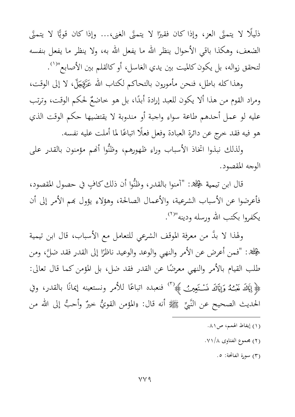 ولهذا لا بدَّ من معرفة الموقف الشرعي للتعامل مع الأسباب، قال ابن تيمية - رحمه الله -: "فمن أعرض عن الأمر والنهي والوعد والوعيد ناظرًا إلى القدر فقد ضلَّ، ومن طلب القيام بالأمر والنهي معرضًا عن القدر فقد ضل، بل المؤمن كما قال تعالى: {إِيَّاكَ نَعْبُدُ وَإِيَّاكَ نَسْتَعِينُ} (¬٣) فنعبده اتباعًا للأمر ونستعينه إيمانًا بالقدر، وفي الحديث الصحيح عن النَّبيِّ - صلى الله عليه وسلم - أنه قال: «المؤمن القويُّ خيرٌ وأحبُّ إلى الله من
