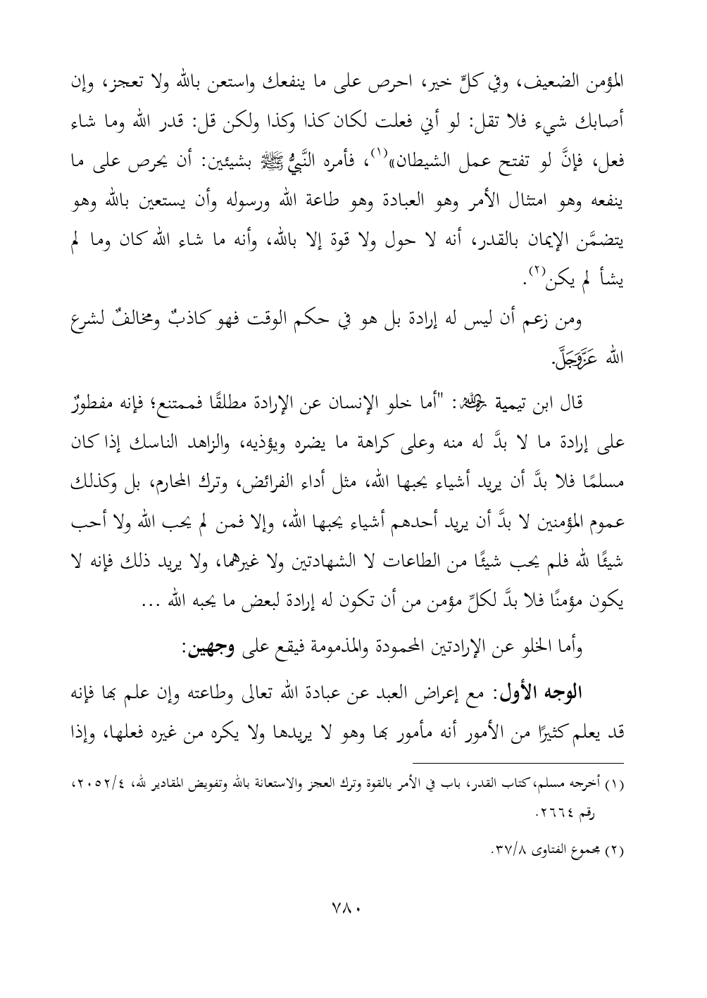 (¬١) أخرجه مسلم، كتاب القدر، باب في الأمر بالقوة وترك العجز والاستعانة بالله وتفويض المقادير لله، ٤/ ٢٠٥٢، رقم ٢٦٦٤.