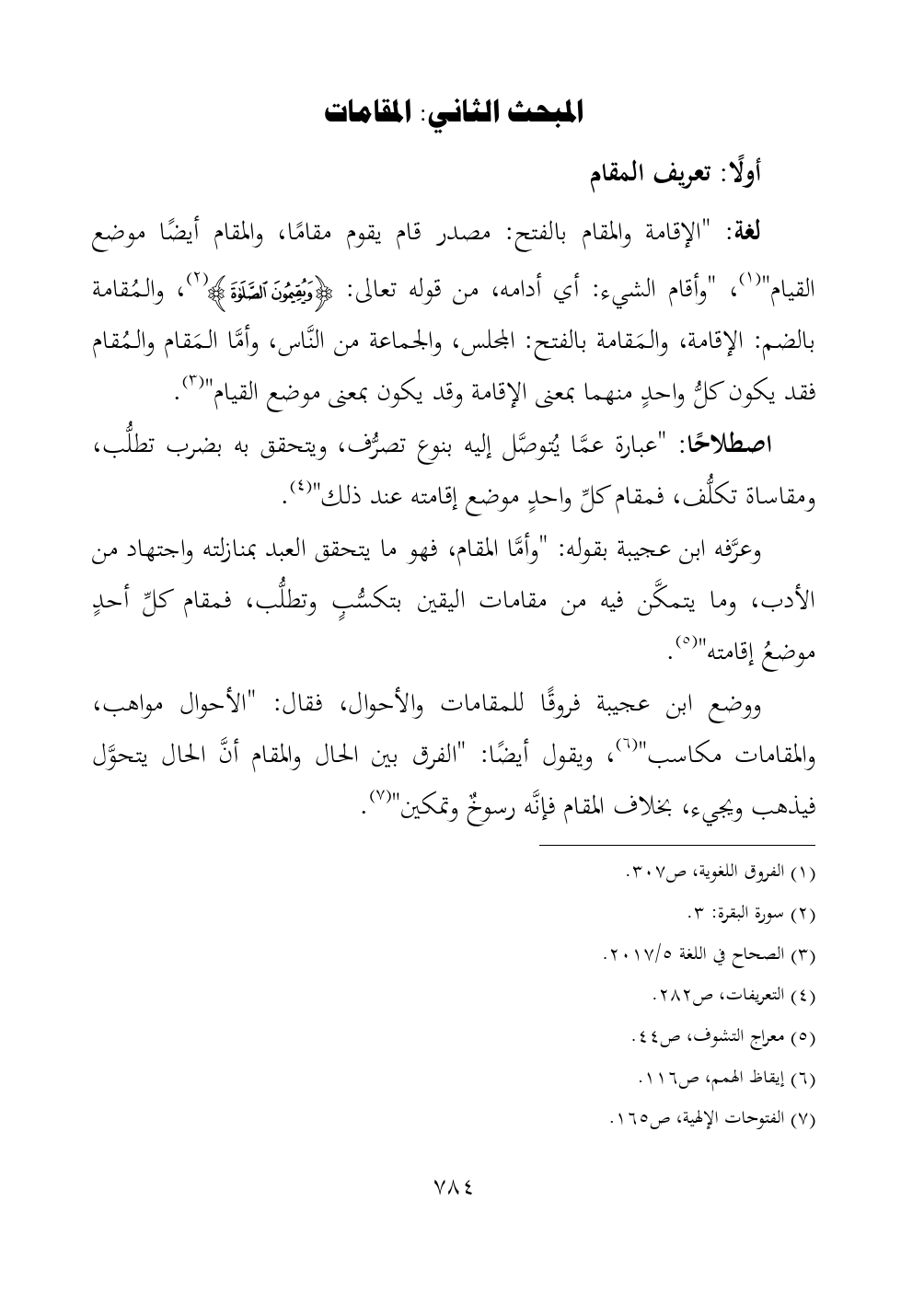 اصطلاحًا: "عبارة عمَّا يُتوصَّل إليه بنوع تصرُّف، ويتحقق به بضرب تطلُّب، ومقاساة تكلُّف، فمقام كلِّ واحدٍ موضع إقامته عند ذلك" (¬٤).