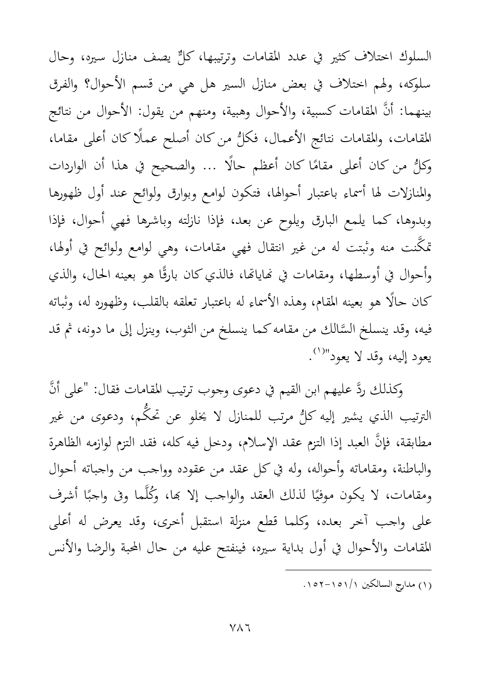 وكذلك ردَّ عليهم ابن القيم في دعوى وجوب ترتيب المقامات فقال: "على أنَّ الترتيب الذي يشير إليه كلُّ مرتب للمنازل لا يخلو عن تحكُّم، ودعوى من غير مطابقة، فإنَّ العبد إذا التزم عقد الإسلام، ودخل فيه كله، فقد التزم لوازمه الظاهرة والباطنة، ومقاماته وأحواله، وله في كل عقد من عقوده وواجب من واجباته أحوال ومقامات، لا يكون موفيًا لذلك العقد والواجب إلا بها، وكُلَّما وفى واجبًا أشرف على واجب آخر بعده، وكلما قطع منزلة استقبل أخرى، وقد يعرض له أعلى المقامات والأحوال في أول بداية سيره، فينفتح عليه من حال المحبة والرضا والأنس