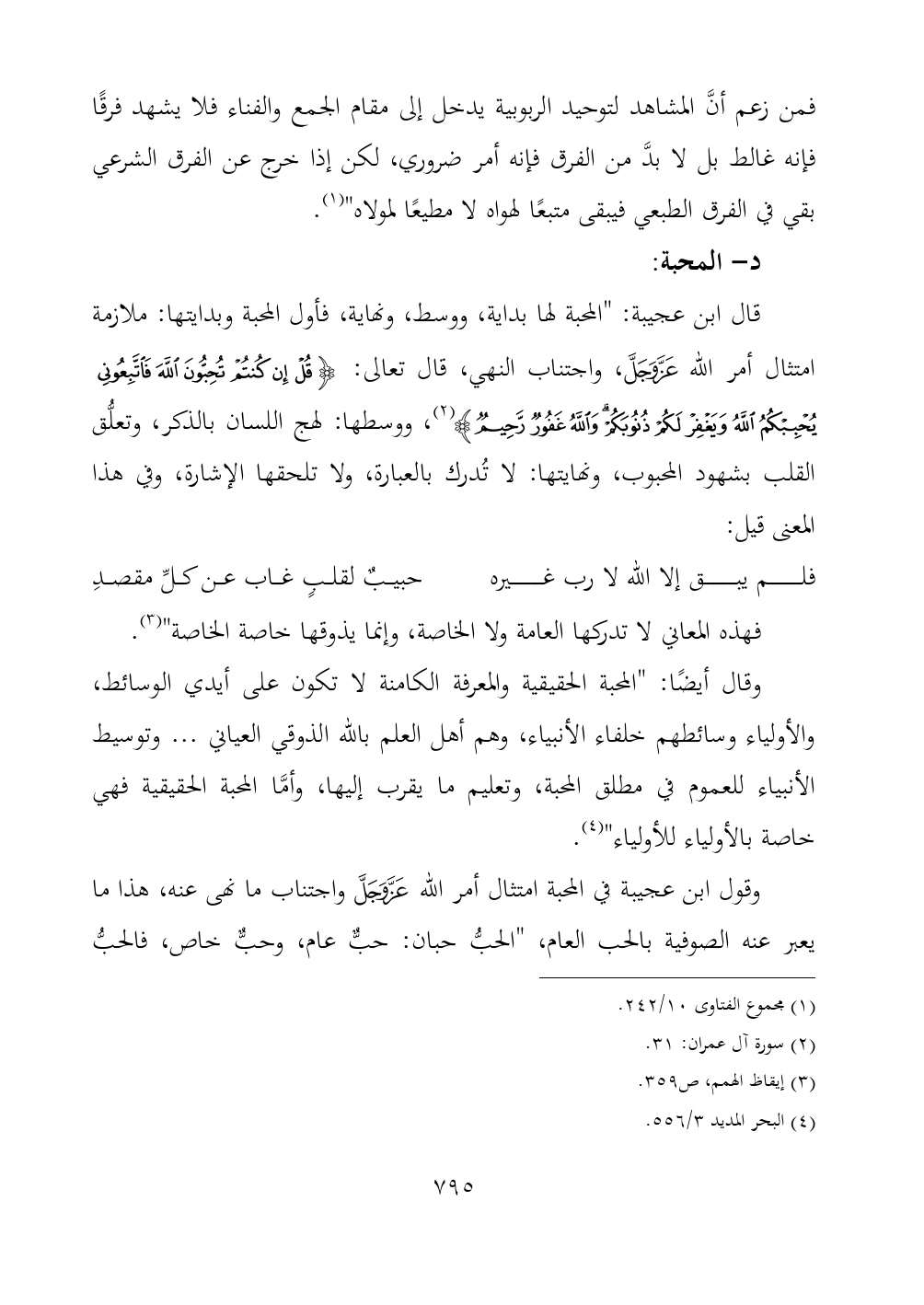 قال ابن عجيبة: "المحبة لها بداية، ووسط، ونهاية، فأول المحبة وبدايتها: ملازمة امتثال أمر الله - عز وجل -، واجتناب النهي، قال تعالى: {قُلْ إِنْ كُنْتُمْ تُحِبُّونَ اللَّهَ فَاتَّبِعُونِي يُحْبِبْكُمُ اللَّهُ وَيَغْفِرْ لَكُمْ ذُنُوبَكُمْ وَاللَّهُ غَفُورٌ رَحِيمٌ} (¬٢)، ووسطها: لهج اللسان بالذكر، وتعلُّق القلب بشهود المحبوب، ونهايتها: لا تُدرك بالعبارة، ولا تلحقها الإشارة، وفي هذا المعنى قيل: