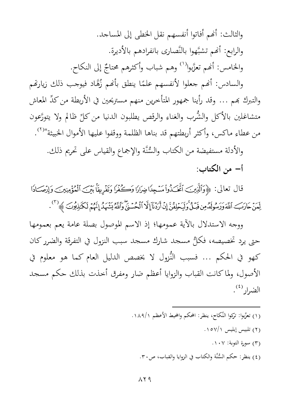 ووجه الاستدلال بالآية عمومها؛ إذ الاسم الموصول بصلة عامة يعم بعمومها حتى يرد تخصيصه، فكلُّ مسجد شارك مسجد سبب النزول في التفرقة والضرر كان كهو في الحكم ... فسبب النُّزول لا يخصص الدليل العام كما هو معلوم في الأصول، ولما كانت القباب والزوايا أعظم ضار ومفرق أخذت بذلك حكم مسجد الضرار (¬٤).