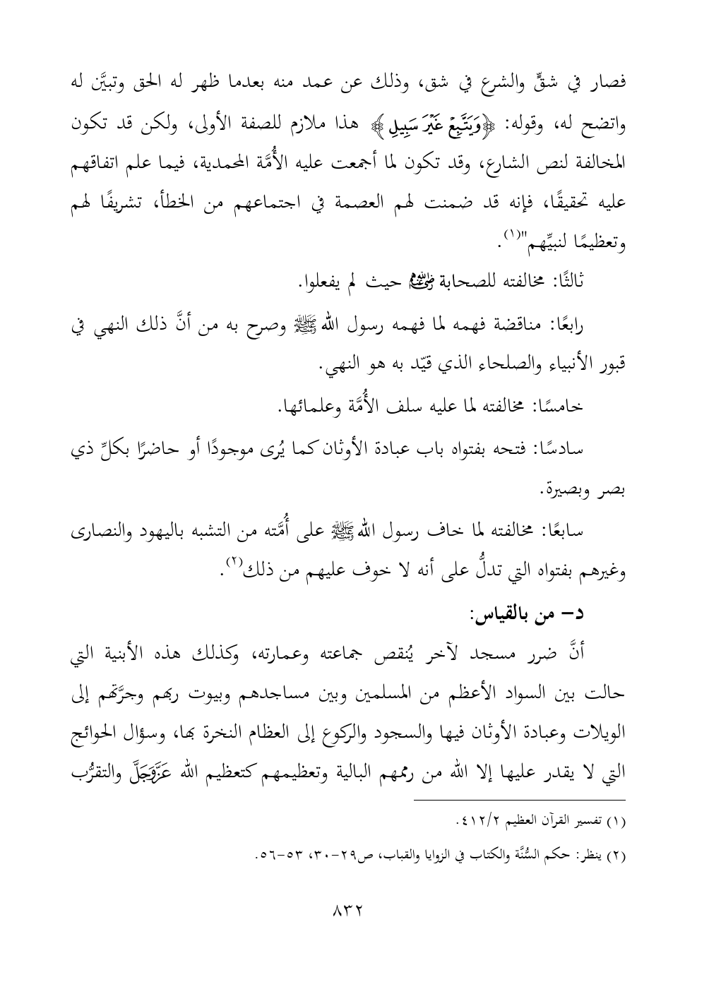 أنَّ ضرر مسجد لآخر يُنقص جماعته وعمارته، وكذلك هذه الأبنية التي حالت بين السواد الأعظم من المسلمين وبين مساجدهم وبيوت ربهم وجرَّتهم إلى الويلات وعبادة الأوثان فيها والسجود والركوع إلى العظام النخرة بها، وسؤال الحوائج التي لا يقدر عليها إلا الله من رممهم البالية وتعظيمهم كتعظيم الله - عز وجل - والتقرُّب