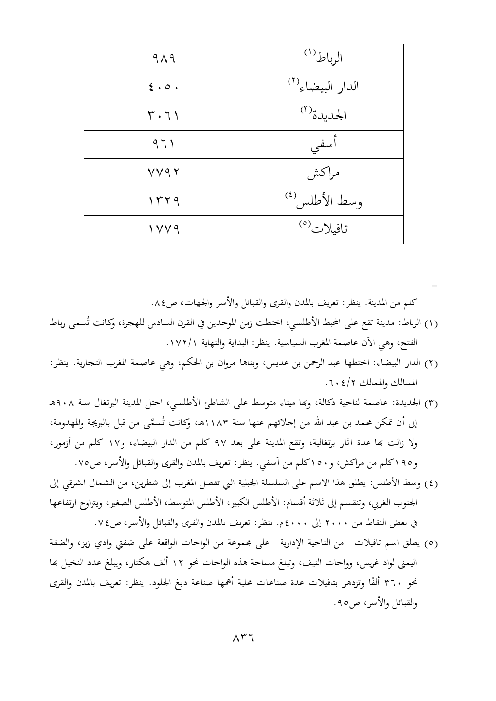 الرباط (¬١) ٩٨٩ الدار البيضاء (¬٢) ٤٠٥٠ الجديدة (¬٣) ٣٠٦١ أسفي ٩٦١ مراكش ٧٧٩٢ وسط الأطلس (¬٤) ١٣٢٩ تافيلات (¬٥) ١٧٧٩