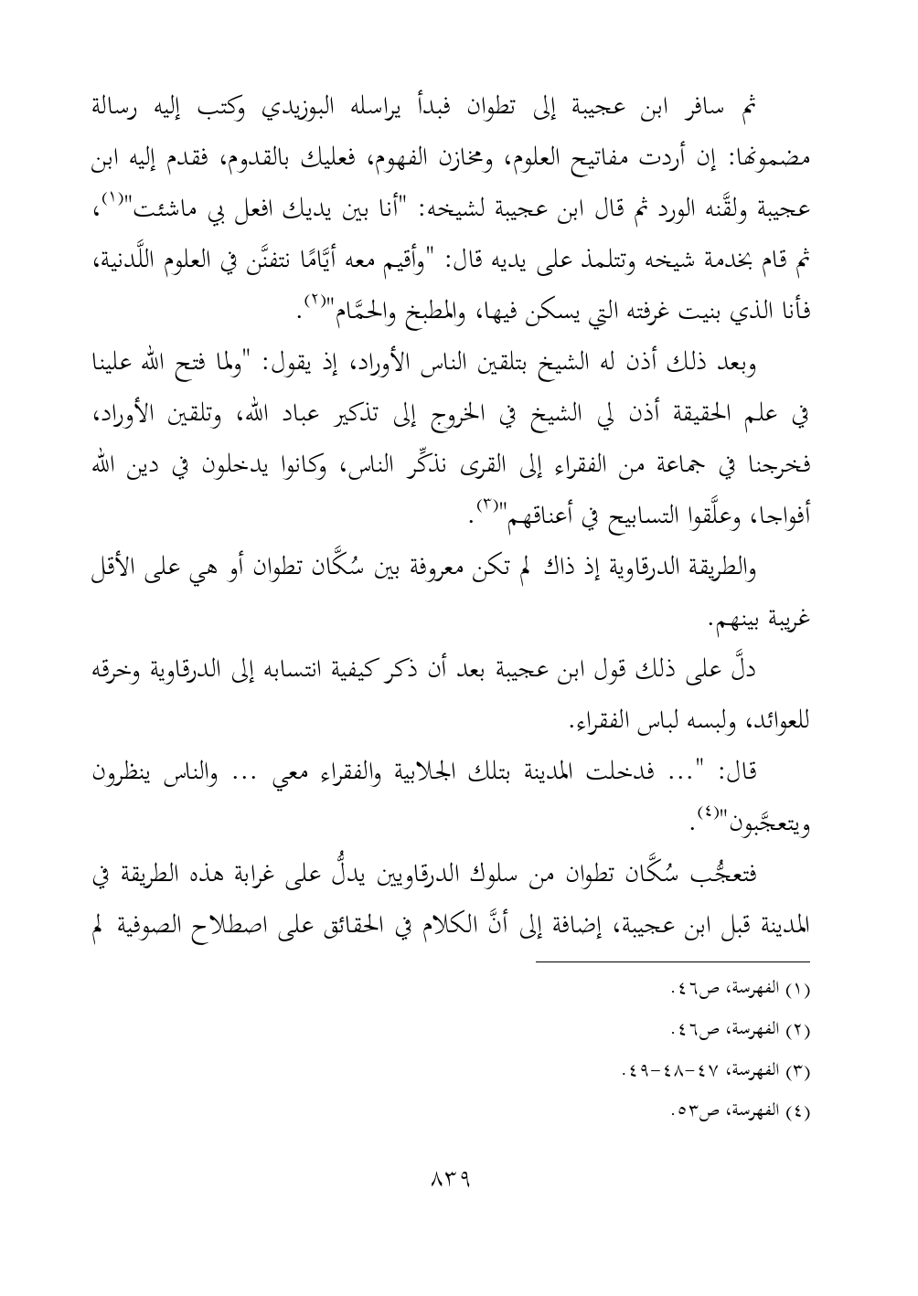 فتعجُّب سُكَّان تطوان من سلوك الدرقاويين يدلُّ على غرابة هذه الطريقة في المدينة قبل ابن عجيبة، إضافة إلى أنَّ الكلام في الحقائق على اصطلاح الصوفية لم