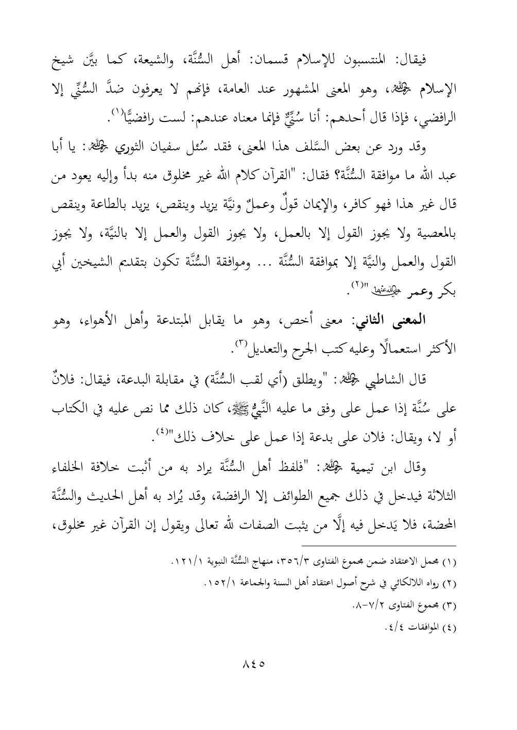 وقال ابن تيمية - رحمه الله -: "فلفظ أهل السُّنَّة يراد به من أثبت خلافة الخلفاء الثلاثة فيدخل في ذلك جميع الطوائف إلا الرافضة، وقد يُراد به أهل الحديث والسُّنَّة المحضة، فلا يَدخل فيه إلَّا من يثبت الصفات لله تعالى ويقول إن القرآن غير مخلوق،