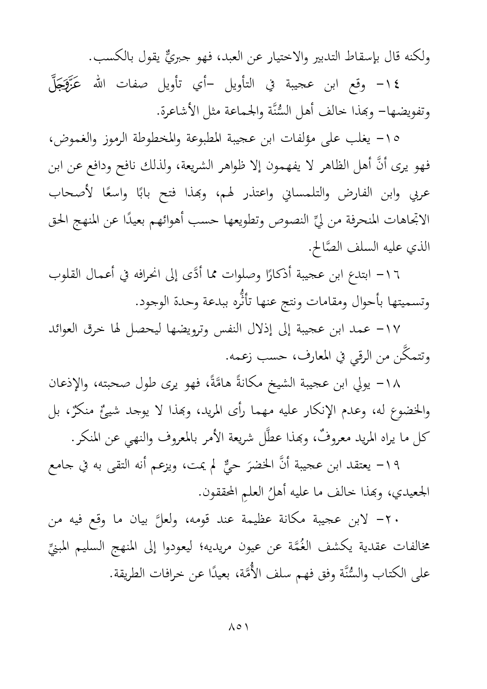 ١٤ - وقع ابن عجيبة في التأويل -أي تأويل صفات الله - عز وجل - ... وتفويضها- وبهذا خالف أهل السُّنَّة والجماعة مثل الأشاعرة.