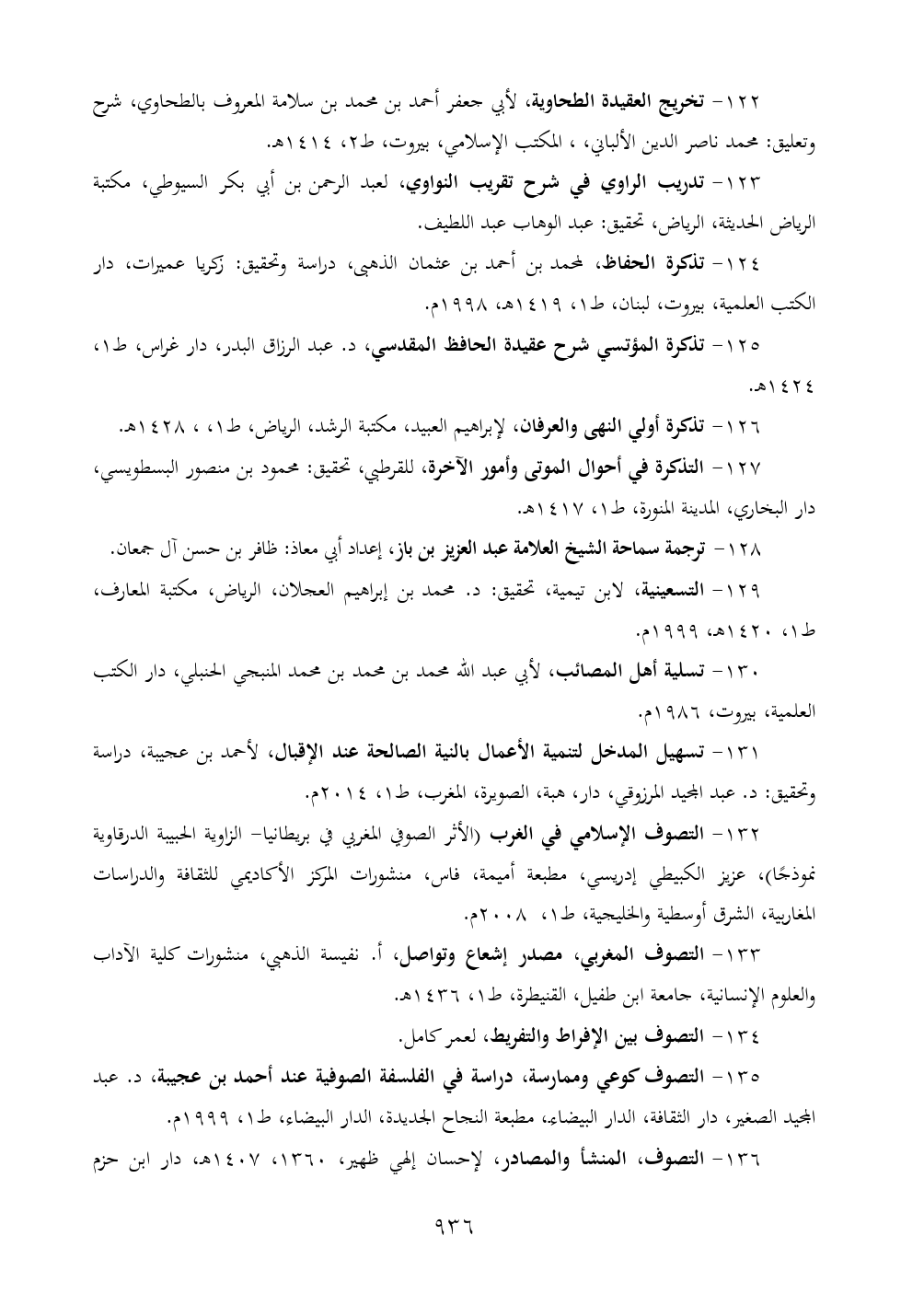 ١٣٥ - التصوف كوعي وممارسة، دراسة في الفلسفة الصوفية عند أحمد بن عجيبة، د. عبد المجيد الصغير، دار الثقافة، الدار البيضاءـ، مطبعة النجاح الجديدة، الدار البيضاء، ط ١، ١٩٩٩ م.