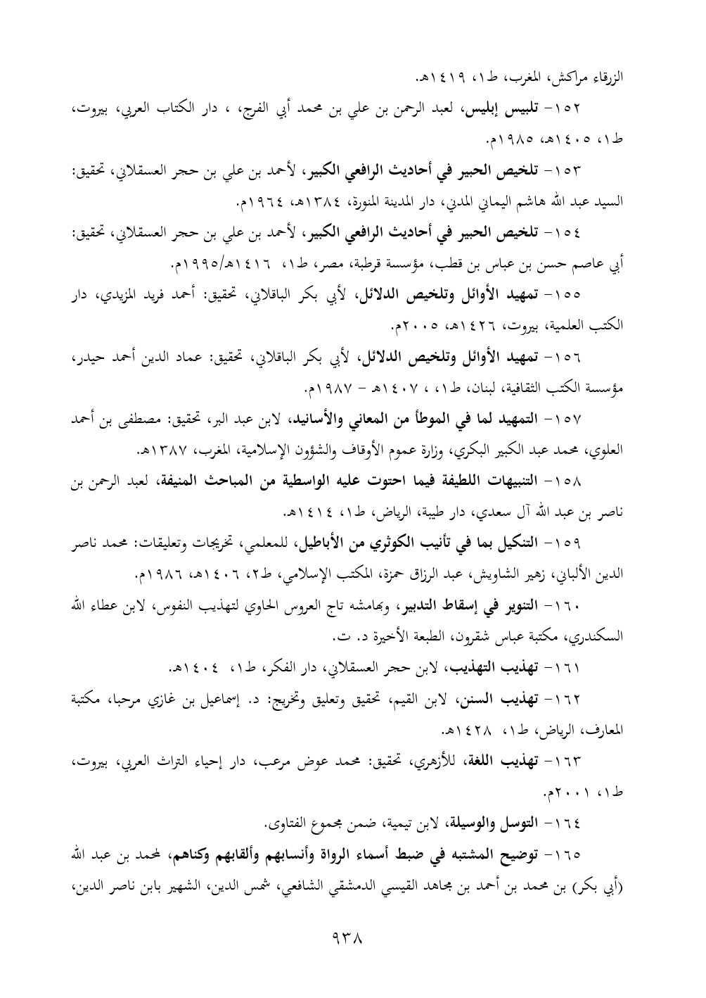 ١٥٣ - تلخيص الحبير في أحاديث الرافعي الكبير، لأحمد بن علي بن حجر العسقلاني، تحقيق: السيد عبد الله هاشم اليماني المدني، دار المدينة المنورة، ١٣٨٤ هـ، ١٩٦٤ م.
